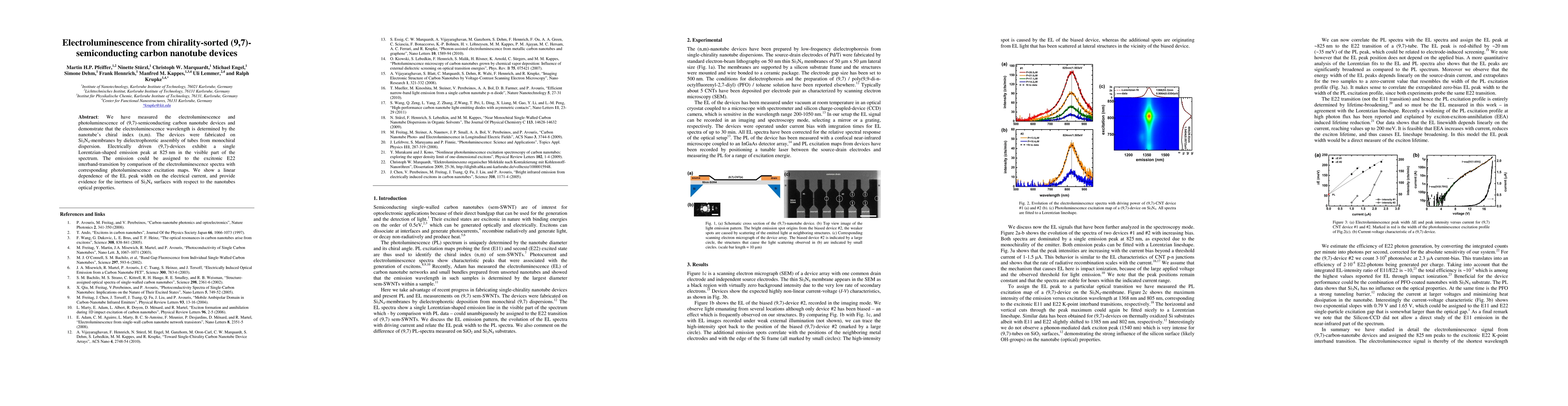 This paper investigates electroluminescence in chirality-sorted (9,7) semiconducting carbon nanotube devices, showing that the emission wavelength correlates with the nanotube's chiral index. The devices exhibit a single emission peak at 825 nm, attributed to the E22 interband transition, with the peak width varying linearly with electrical current.