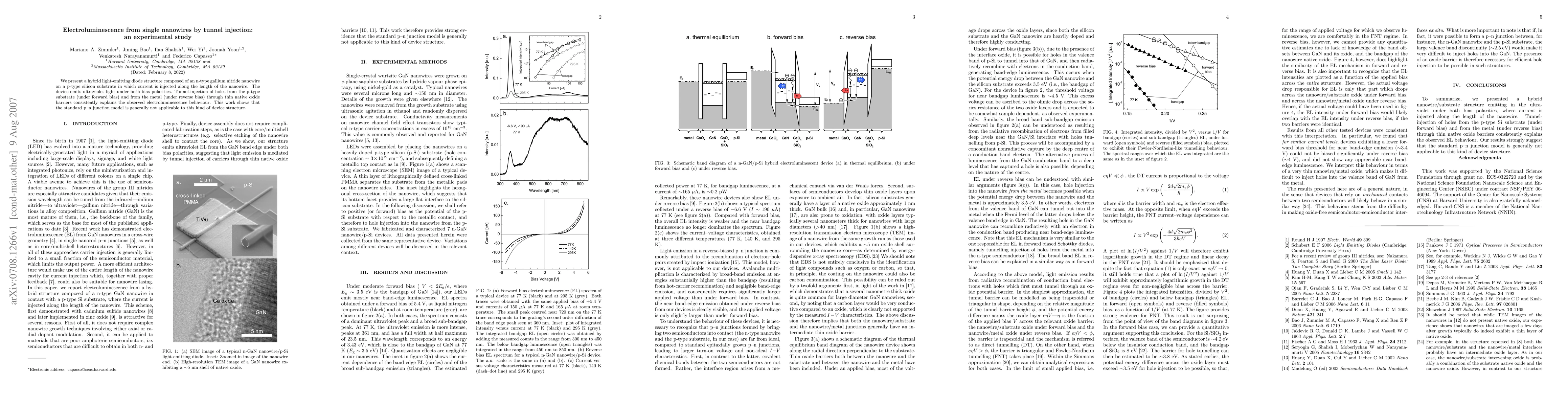 We present a hybrid light-emitting diode structure composed of an n-type gallium nitride nanowire on a p-type silicon substrate in which current is injected along the length of the nanowire. The device emits ultraviolet light under both bias polarities. Tunnel-injection of holes from the p-type substrate (under forward bias) and from the metal (under reverse bias) through thin native oxide barriers consistently explains the observed electroluminescence behaviour. This work shows that the standard p-n junction model is generally not applicable to this kind of device structure.