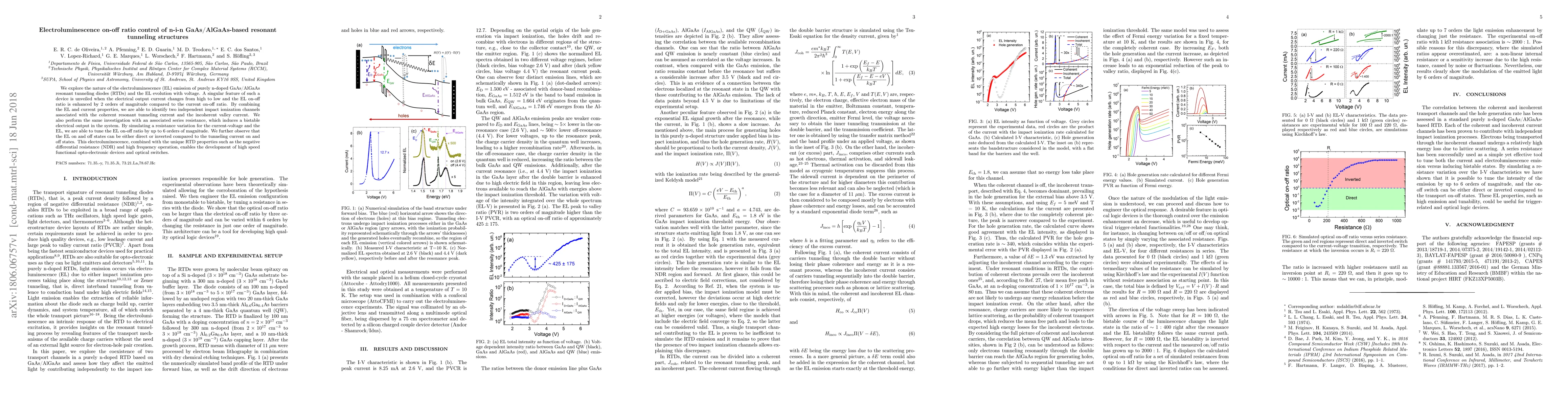 We explore the nature of the electroluminescence (EL) emission of purely n-doped GaAs/AlGaAs resonant tunneling diodes (RTDs) and the EL evolution with voltage. A singular feature of such a device is unveiled when the electrical output current changes from high to low and the EL on-off ratio is enhanced by 2 orders of magnitude compared to the current on-off ratio. By combining the EL and current properties, we are able to identify two independent impact ionization channels associated with the coherent resonant tunneling current and the incoherent valley current. We also perform the same investigation with an associated series resistance, which induces a bistable electrical output in the system. By simulating a resistance variation for the current-voltage and the EL, we are able to tune the EL on-off ratio by up to 6 orders of magnitude. We further observe that the EL on and off states can be either direct or inverted compared to the tunneling current on and off states. This electroluminescence, combined with the unique RTD properties such as the negative differential resistance (NDR) and high frequency operation, enables the development of high speed functional opto-electronic devices and optical switches.