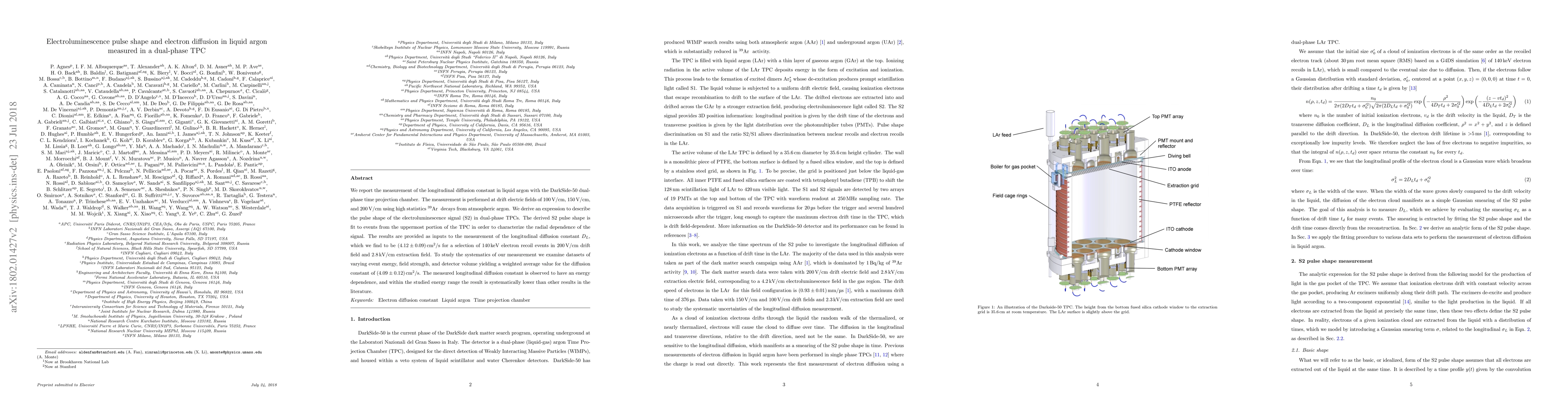 We report the measurement of the longitudinal diffusion constant in liquid argon with the DarkSide-50 dual-phase time projection chamber. The measurement is performed at drift electric fields of 100 V/cm, 150 V/cm, and 200 V/cm using high statistics $^{39}$Ar decays from atmospheric argon. We derive an expression to describe the pulse shape of the electroluminescence signal (S2) in dual-phase TPCs. The derived S2 pulse shape is fit to events from the uppermost portion of the TPC in order to characterize the radial dependence of the signal. The results are provided as inputs to the measurement of the longitudinal diffusion constant DL, which we find to be (4.12 $\pm$ 0.04) cm$^2$/s for a selection of 140keV electron recoil events in 200V/cm drift field and 2.8kV/cm extraction field. To study the systematics of our measurement we examine datasets of varying event energy, field strength, and detector volume yielding a weighted average value for the diffusion constant of (4.09 $\pm$ 0.09) cm$^2$ /s. The measured longitudinal diffusion constant is observed to have an energy dependence, and within the studied energy range the result is systematically lower than other results in the literature.