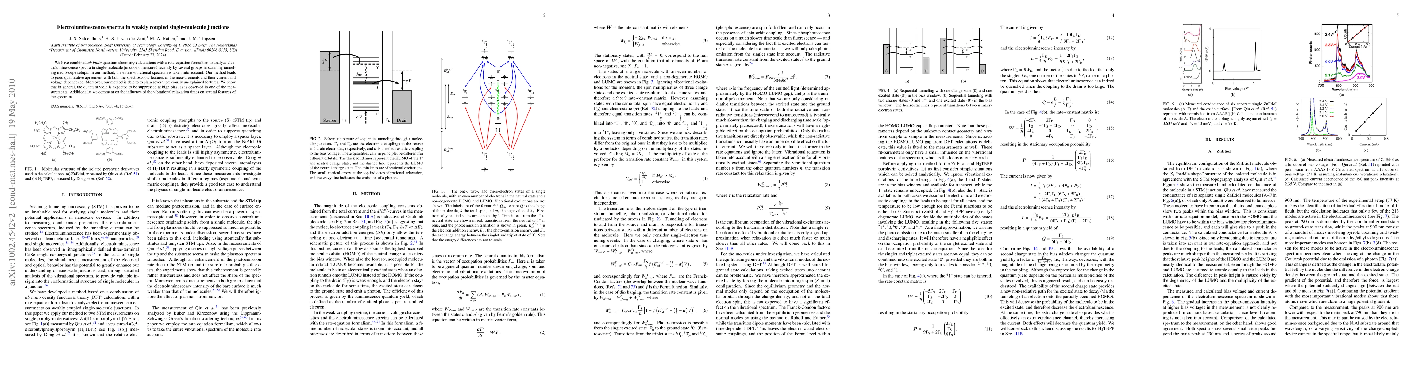The study combines quantum chemistry and rate-equation formalism to analyze electroluminescence in single-molecule junctions, showing good agreement with experimental spectra and explaining previously unexplained features, including suppressed quantum yield at high bias. The research also discusses the impact of vibrational relaxation times on spectral features.