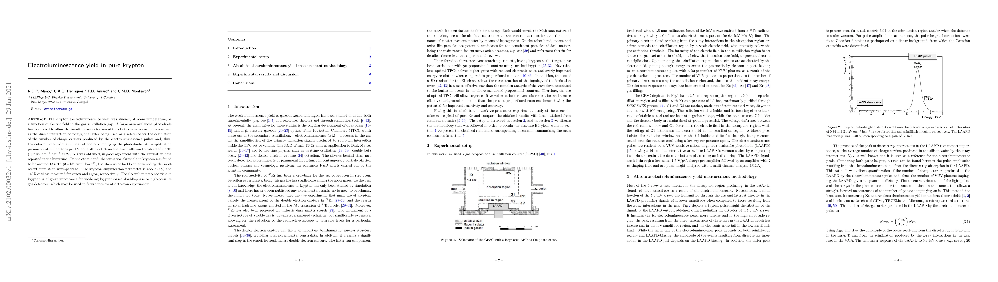 The study investigated krypton electroluminescence yield at room temperature under varying electric fields, with key findings including an amplification parameter of 113 photons per kV and a scintillation threshold of 2.7 Td.