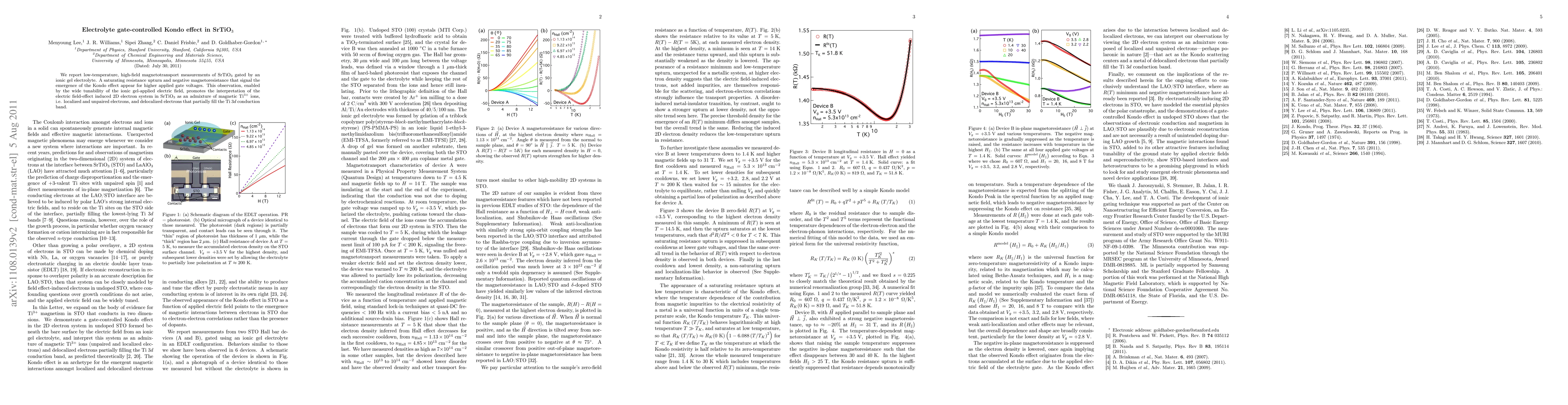 We report low-temperature, high-field magnetotransport measurements of SrTiO3 gated by an ionic gel electrolyte. A saturating resistance upturn and negative magnetoresistance that signal the emergence of the Kondo effect appear for higher applied gate voltages. This observation, enabled by the wide tunability of the ionic gel-applied electric field, promotes the interpretation of the electric field-effect induced 2D electron system in SrTiO3 as an admixture of magnetic Ti3+ ions, i.e. localized and unpaired electrons, and delocalized electrons that partially fill the Ti 3d conduction band.