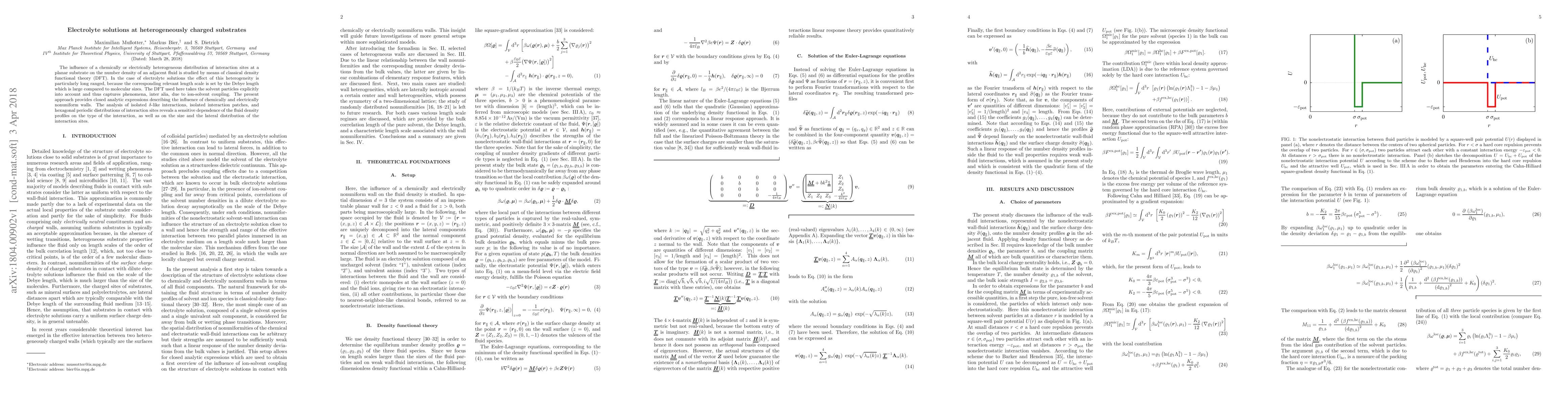 The influence of a chemically or electrically heterogeneous distribution of interaction sites at a planar substrate on the number density of an adjacent fluid is studied by means of classical density functional theory (DFT). In the case of electrolyte solutions the effect of this heterogeneity is particularly long ranged, because the corresponding relevant length scale is set by the Debye length which is large compared to molecular sizes. The DFT used here takes the solvent particles explicitly into account and thus captures phenomena, inter alia, due to ion-solvent coupling. The present approach provides closed analytic expressions describing the influence of chemically and electrically nonuniform walls. The analysis of isolated \delta-like interactions, isolated interaction patches, and hexagonal periodic distributions of interaction sites reveals a sensitive dependence of the fluid density profiles on the type of the interaction, as well as on the size and the lateral distribution of the interaction sites.