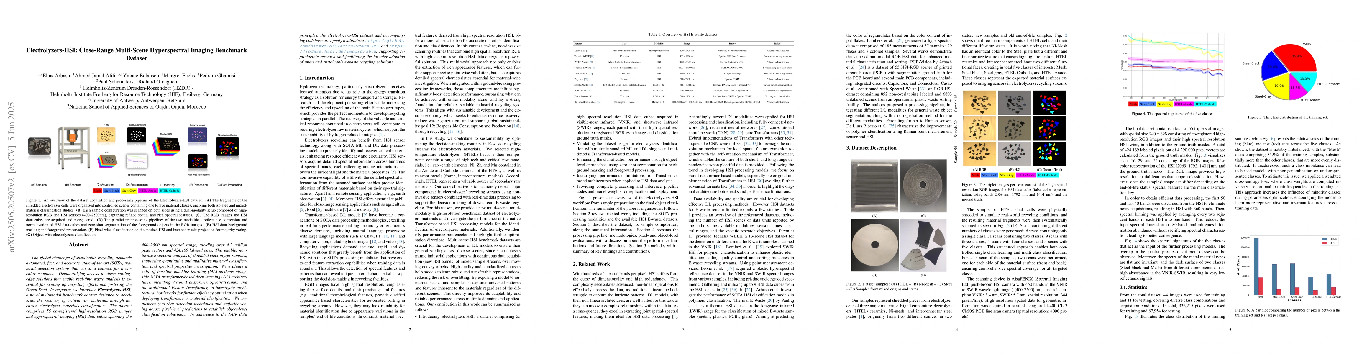 A new dataset called Electrolyzers-HSI has been introduced to accelerate sustainable recycling efforts through accurate material detection using hyperspectral imaging. The dataset contains 55 images and 4.2 million labeled pixel vectors, enabling non-invasive spectral analysis of shredded electrolyzer samples.