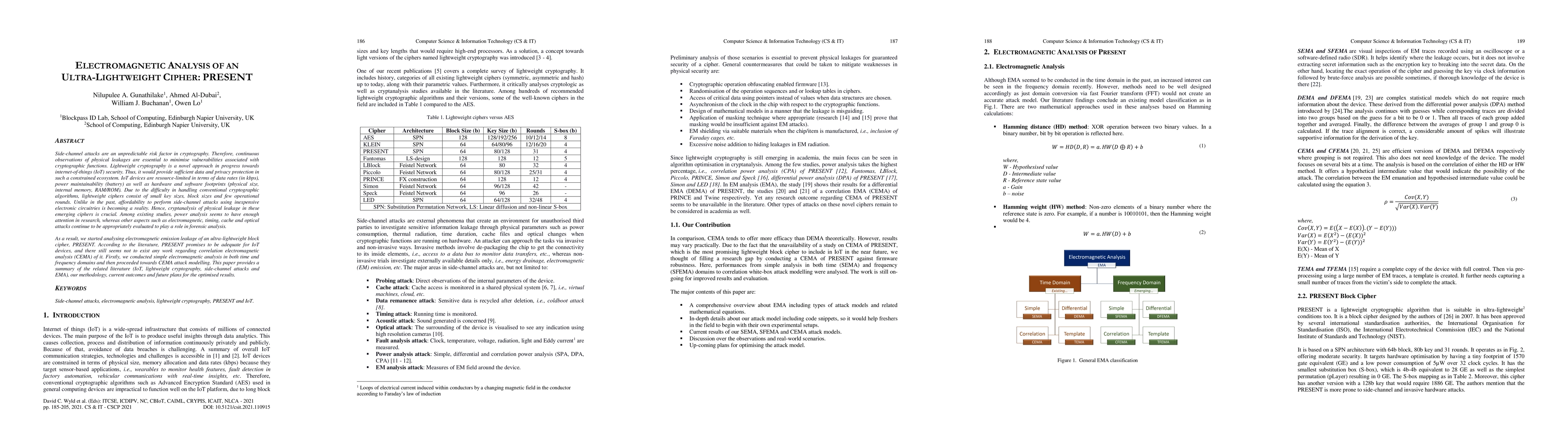 Side-channel attacks are an unpredictable risk factor in cryptography. Therefore, continuous observations of physical leakages are essential to minimise vulnerabilities associated with cryptographic functions. Lightweight cryptography is a novel approach in progress towards internet-of-things (IoT) security. Thus, it would provide sufficient data and privacy protection in such a constrained ecosystem. IoT devices are resource-limited in terms of data rates (in kbps), power maintainability (battery) as well as hardware and software footprints (physical size, internal memory, RAM/ROM). Due to the difficulty in handling conventional cryptographic algorithms, lightweight ciphers consist of small key sizes, block sizes and few operational rounds. Unlike in the past, affordability to perform side-channel attacks using inexpensive electronic circuitries is becoming a reality. Hence, cryptanalysis of physical leakage in these emerging ciphers is crucial. Among existing studies, power analysis seems to have enough attention in research, whereas other aspects such as electromagnetic, timing, cache and optical attacks continue to be appropriately evaluated to play a role in forensic analysis. As a result, we started analysing electromagnetic emission leakage of an ultra-lightweight block cipher, PRESENT. According to the literature, PRESENT promises to be adequate for IoT devices, and there still seems not to exist any work regarding correlation electromagnetic analysis (CEMA) of it. Firstly, we conducted simple electromagnetic analysis in both time and frequency domains and then proceeded towards CEMA attack modelling. This paper provides a summary of the related literature (IoT, lightweight cryptography, side-channel attacks and EMA), our methodology, current outcomes and future plans for the optimised results.