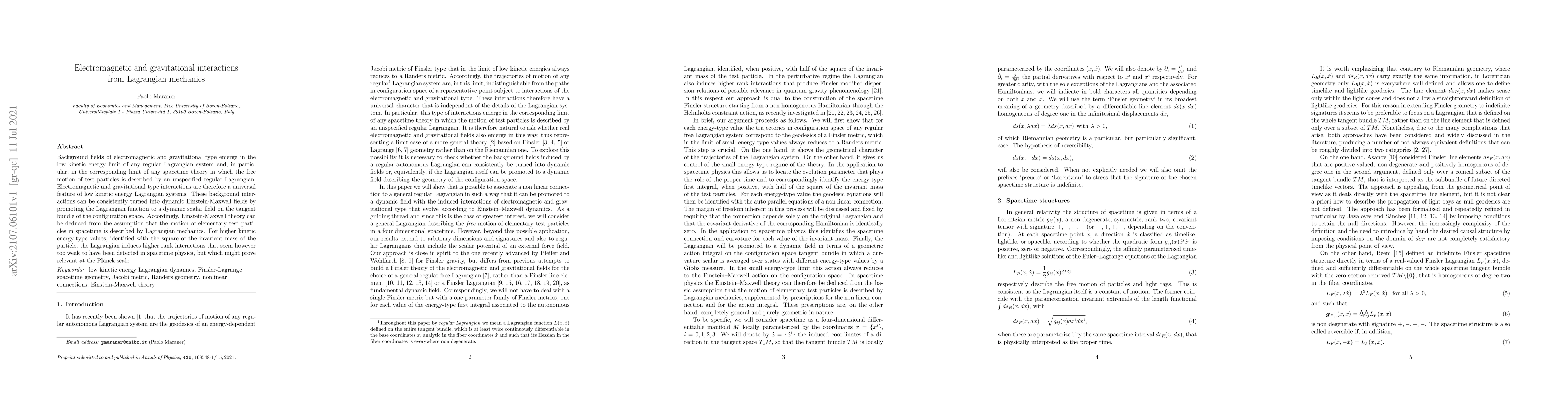 Background fields of electromagnetic and gravitational type emerge in the low kinetic energy limit of any regular Lagrangian system and, in particular, in the corresponding limit of any spacetime theory in which the free motion of test particles is described by an unspecified regular Lagrangian. Electromagnetic and gravitational type interactions are therefore a universal feature of low kinetic energy Lagrangian systems. These background interactions can be consistently turned into dynamic Einstein-Maxwell fields by promoting the Lagrangian function to a dynamic scalar field on the tangent bundle of the configuration space. Accordingly, Einstein-Maxwell theory can be deduced from the assumption that the motion of elementary test particles in spacetime is described by Lagrangian mechanics. For higher kinetic energy-type values, identified with the square of the invariant mass of the particle, the Lagrangian induces higher rank interactions that seem however too weak to have been detected in spacetime physics, but which might prove relevant at the Planck scale.