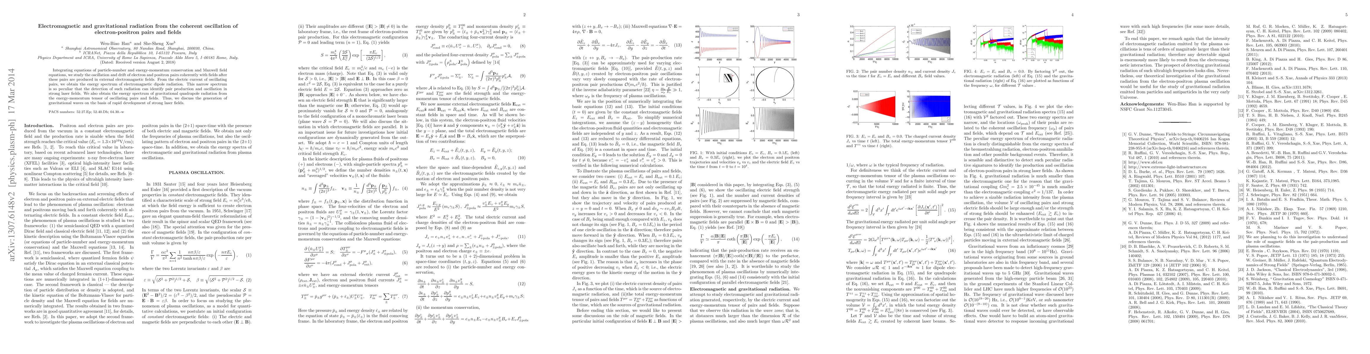 Integrating equations of particle-number and energy-momentum conservation and Maxwell field equations, we study the oscillation and drift of electron and positron pairs coherently with fields after these pairs are produced in external electromagnetic fields. From the electric current of oscillating pairs, we obtain the energy spectrum of electromagnetic dipole radiation. This narrow spectrum is so peculiar that the detection of such radiation can identify pair production and oscillation in strong laser fields. We also obtain the energy spectrum of gravitational quadrapole radiation from the energy-momentum tensor of oscillating pairs and fields. Thus, we discuss the generation of gravitational waves on the basis of rapid development of strong laser fields.