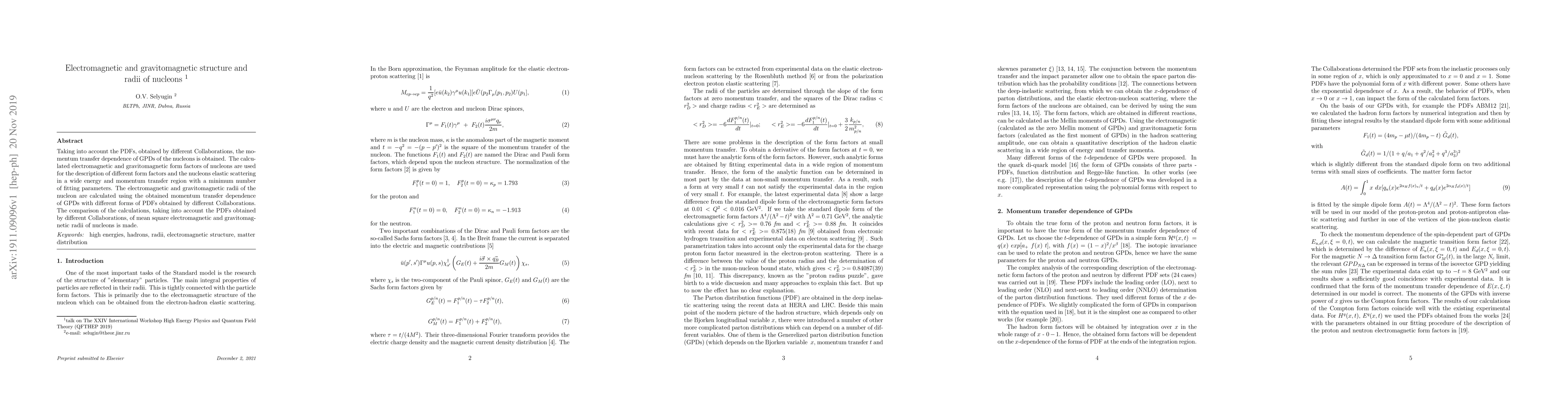 Taking into account the PDFs, obtained by different Collaborations, the momentum transfer dependence of GPDs of the nucleons is obtained. The calculated electromagnetic and gravitomagnetic form factors of nucleons are used for the description of different form factors and the nucleons elastic scattering in a wide energy and momentum transfer region with a minimum number of fitting parameters. The electromagnetic and gravitomagnetic radii of the nucleon are calculated using the obtained momentum transfer dependence of GPDs with different forms of PDFs obtained by different Collaborations. The comparison of the calculations, taking into account the PDFs obtained by different Collaborations, of mean square electromagnetic and gravitomagnetic radii of nucleons is made.
