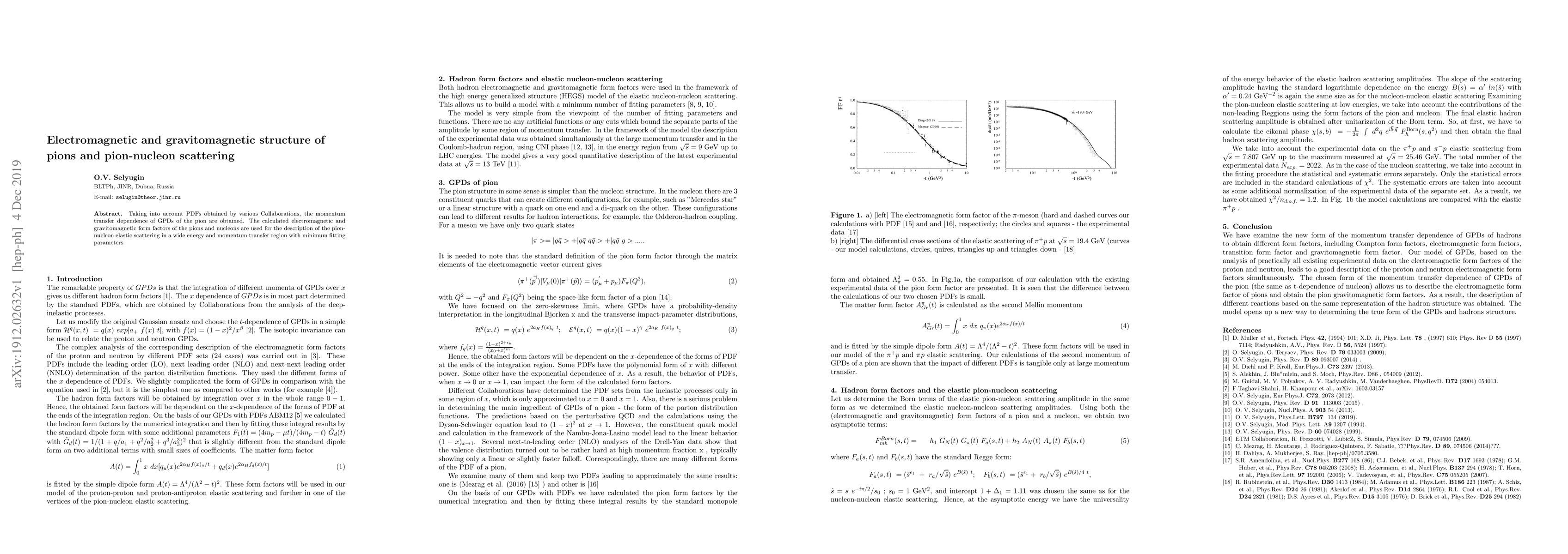 Taking into account PDFs obtained by various Collaborations, the momentum transfer dependence of GPDs of the pion are obtained. The calculated electromagnetic and gravitomagnetic form factors of the pions and nucleons are used for the description of the pion-nucleon elastic scattering in a wide energy and momentum transfer region with minimum fitting parameters.