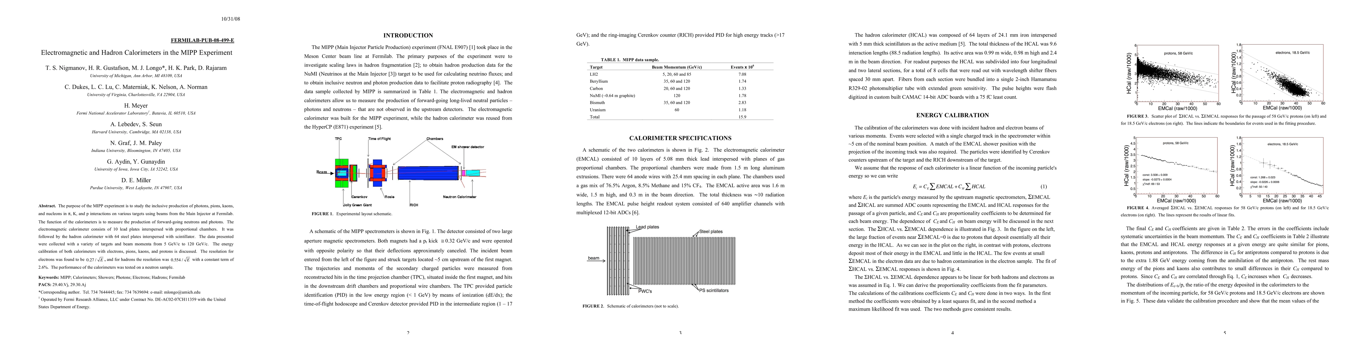The MIPP experiment utilizes electromagnetic and hadron calorimeters to measure the production of forward-going neutrons and photons in particle interactions. The electromagnetic calorimeter features lead plates and proportional chambers, while the hadron calorimeter uses steel plates interspersed with scintillator, demonstrating resolutions of 0.27/sqrt(E) for electrons and 0.554/sqrt(E) for hadrons.