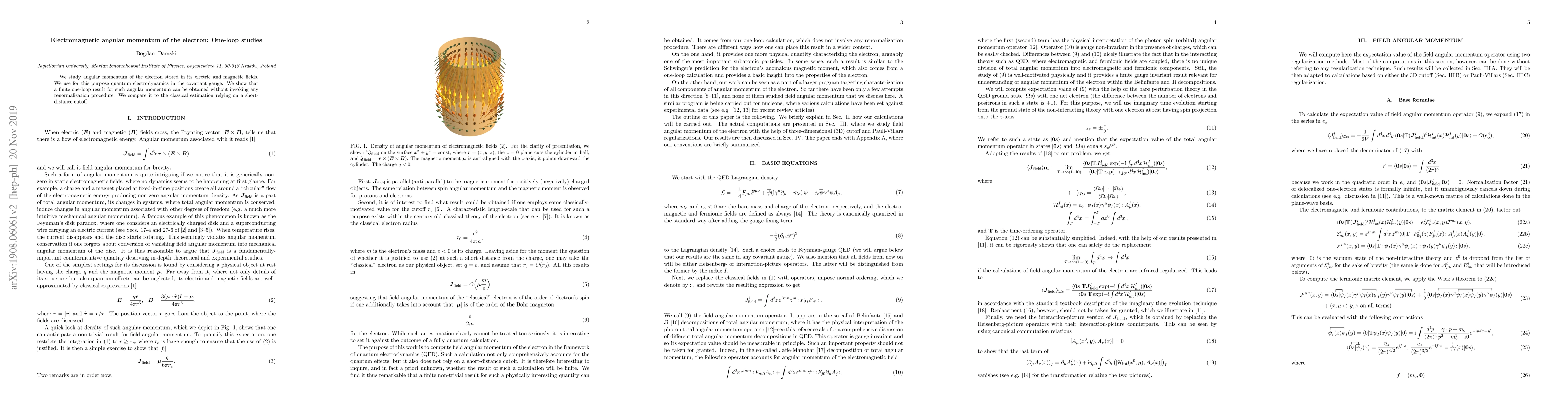 This paper investigates the electromagnetic angular momentum of the electron within quantum electrodynamics, demonstrating that a finite one-loop result can be obtained without renormalization, and compares it to classical estimates using a short-distance cutoff.