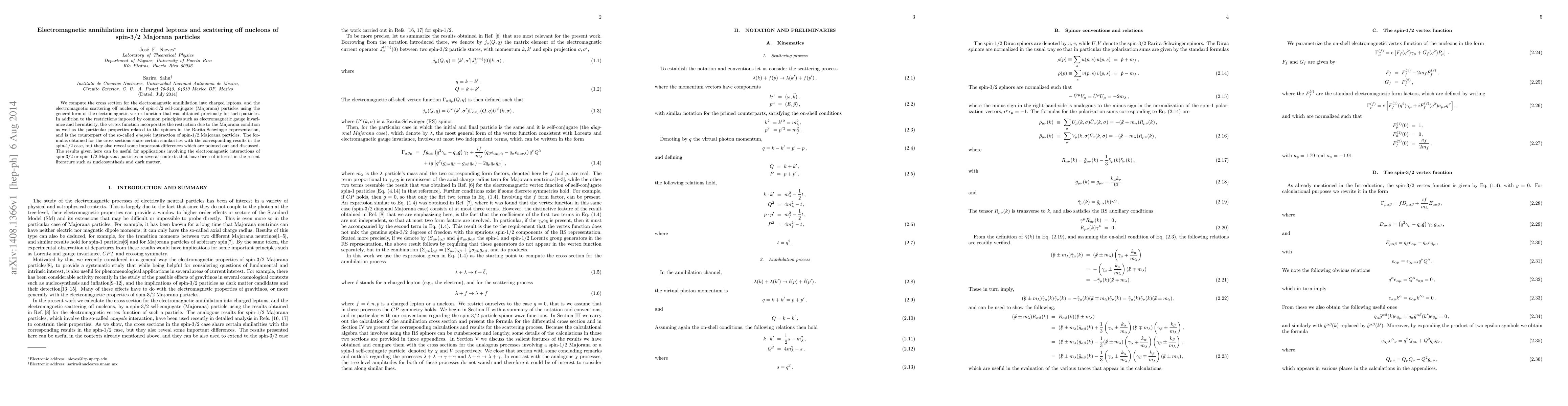 This paper calculates the electromagnetic annihilation cross section into charged leptons and scattering off nucleons for spin-3/2 Majorana particles, using a specialized vertex function. It highlights similarities and differences with spin-1/2 Majorana particles and discusses potential applications in nucleosynthesis and dark matter research.