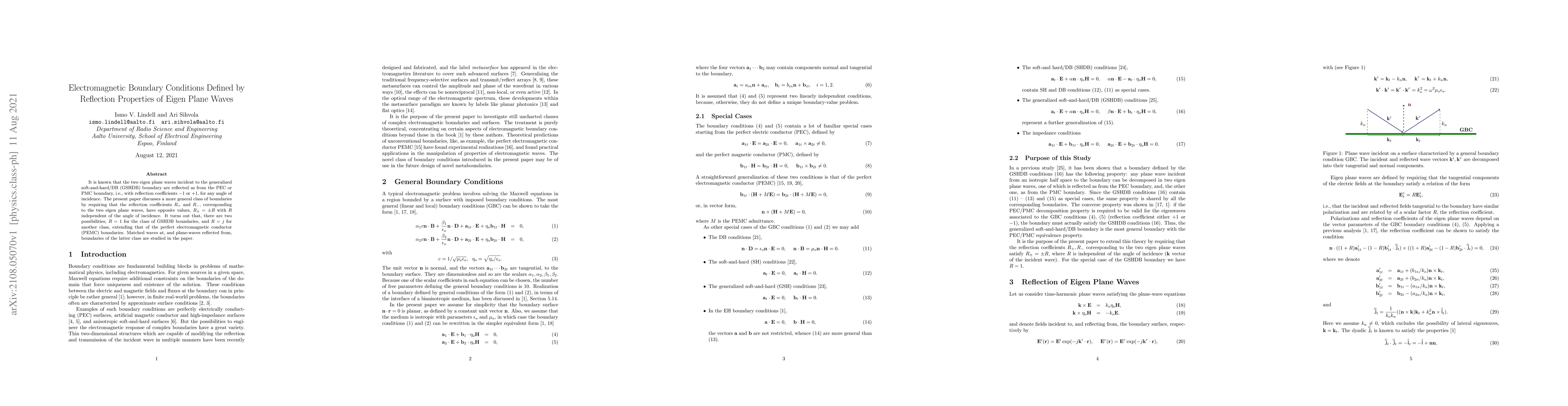 This paper explores electromagnetic boundary conditions defined by reflection properties of eigen plane waves, showing that two classes of boundaries exist: one with reflection coefficients $R=1$ (GSHDB boundaries) and another with $R=j$ (extending PEMC boundaries), both independent of the angle of incidence. The study focuses on matched waves and reflected plane waves for the latter class.