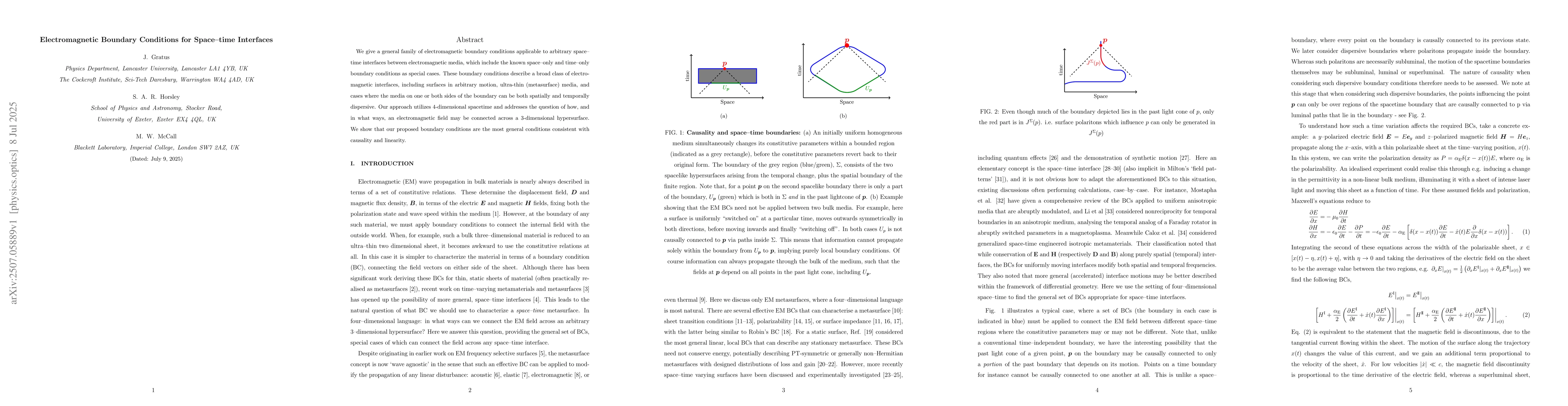 We give a general family of electromagnetic boundary conditions applicable to arbitrary space--time interfaces between electromagnetic media, which include the known space--only and time--only boundary conditions as special cases. These boundary conditions describe a broad class of electromagnetic interfaces, including surfaces in arbitrary motion, ultra-thin (metasurface) media, and cases where the media on one or both sides of the boundary can be both spatially and temporally dispersive. Our approach utilizes 4-dimensional spacetime and addresses the question of how, and in what ways, an electromagnetic field may be connected across a 3-dimensional hypersurface. We show that our proposed boundary conditions are the most general conditions consistent with causality and linearity.