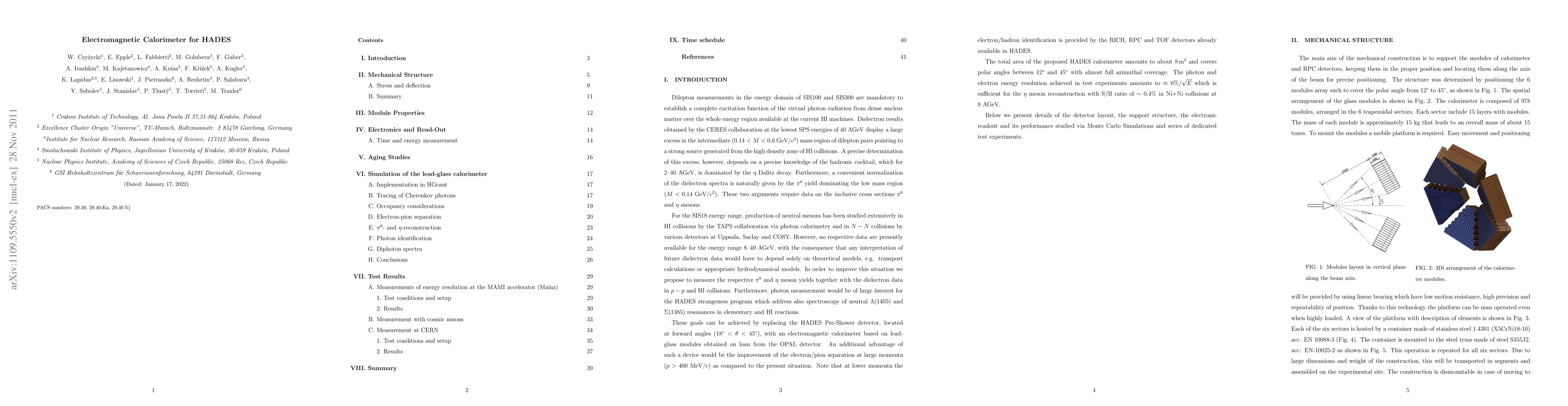 We propose to build the Electromagnetic calorimeter for the HADES di-lepton spectrometer. It will enable to measure the data on neutral meson production from nucleus-nucleus collisions, which are essential for interpretation of dilepton data, but are unknown in the energy range of planned experiments (2-10 GeV per nucleon). The calorimeter will improve the electron-hadron separation, and will be used for detection of photons from strange resonances in elementary and HI reactions. Detailed description of the detector layout, the support structure, the electronic readout and its performance studied via Monte Carlo simulations and series of dedicated test experiments is presented. The device will cover the total area of about 8 m^2 at polar angles between 12 and 45 degrees with almost full azimuthal coverage. The photon and electron energy resolution achieved in test experiments amounts to 5-6%/sqrt(E[GeV]) which is sufficient for the eta meson reconstruction with S/B ratio of 0.4% in Ni+Ni collisions at 8 AGeV. A purity of the identified leptons after the hadron rejection, resulting from simulations based on the test measurements, is better than 80% at momenta above 500 MeV/c, where time-of-flight cannot be used.