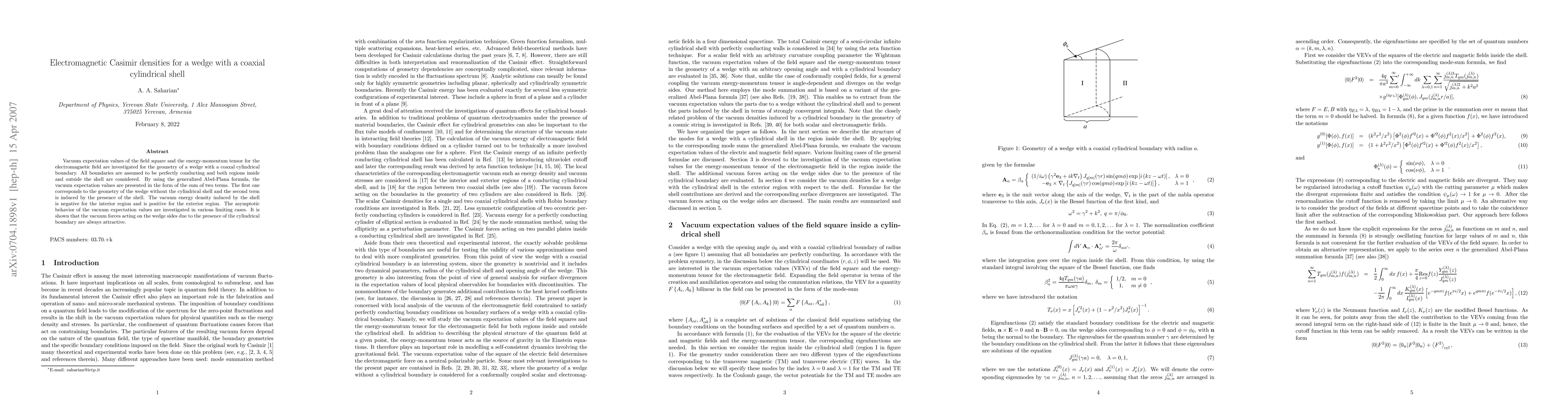 Researchers studied how electromagnetic fields interact with a wedge-shaped object surrounded by a coaxial cylindrical shell, finding that the presence of the shell induces negative energy density inside and positive energy density outside, always resulting in attractive forces on the wedge sides.