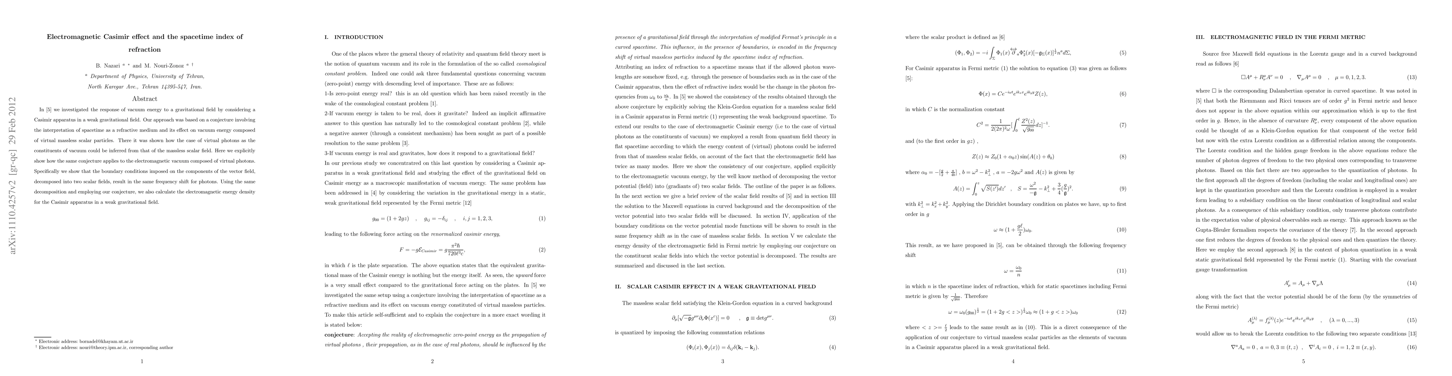 This paper extends previous research on the electromagnetic Casimir effect by applying a refractive medium interpretation of spacetime to show how boundary conditions on virtual photons lead to a frequency shift, analogous to massless scalar fields, and calculates the electromagnetic energy density in a weak gravitational field.