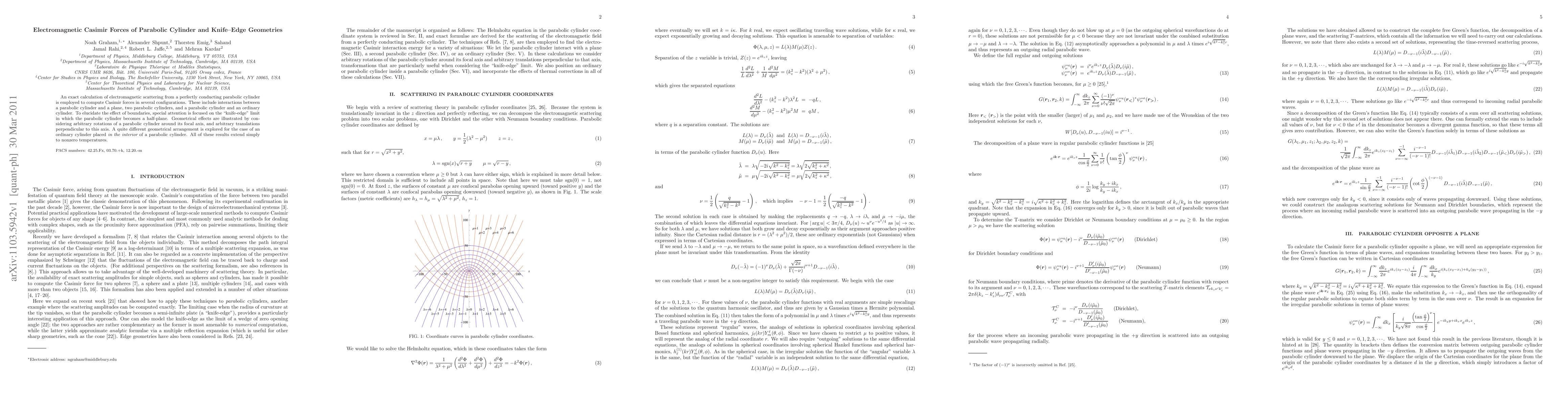 An exact calculation of electromagnetic scattering from a perfectly conducting parabolic cylinder is employed to compute Casimir forces in several configurations. These include interactions between a parabolic cylinder and a plane, two parabolic cylinders, and a parabolic cylinder and an ordinary cylinder. To elucidate the effect of boundaries, special attention is focused on the "knife-edge" limit in which the parabolic cylinder becomes a half-plane. Geometrical effects are illustrated by considering arbitrary rotations of a parabolic cylinder around its focal axis, and arbitrary translations perpendicular to this axis. A quite different geometrical arrangement is explored for the case of an ordinary cylinder placed in the interior of a parabolic cylinder. All of these results extend simply to nonzero temperatures.