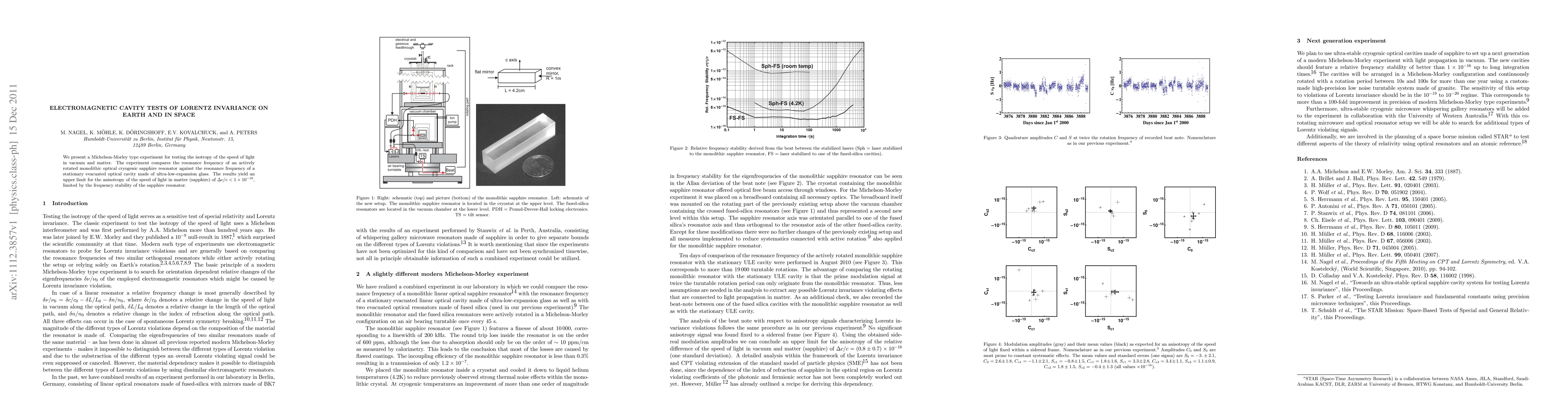 This paper reports on a Michelson-Morley experiment using cryogenic sapphire and ultra-low-expansion glass resonators to test Lorentz invariance, achieving an upper limit of < 1 x 10^-16 for the anisotropy of light speed in matter, constrained by the sapphire resonator's frequency stability.