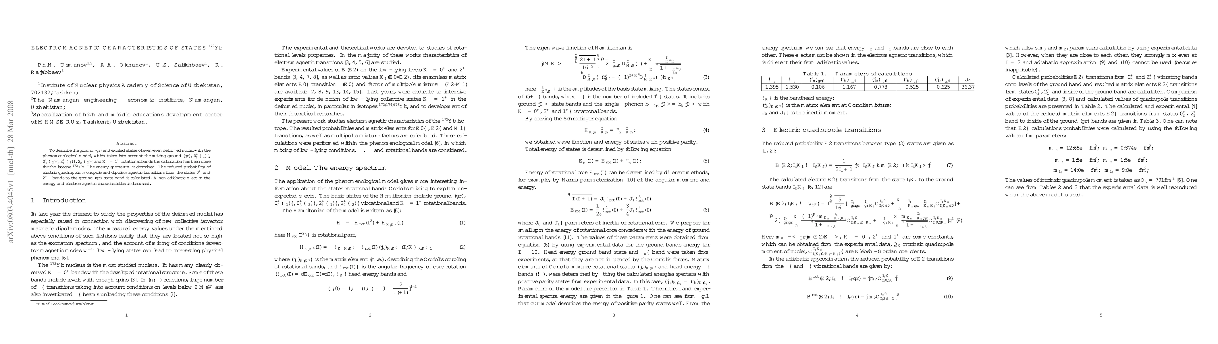 To describe the ground (gr) and excited states of even-even deformed nuclei with the phenomenological model, which takes into account the mixing ground $(gr)$, $0^{+}_{2}(\beta_1)$--, $0^{+}_{3}(\beta_2)$--, $2^{+}_{1}(\gamma_1)$--, $2^{+}_{2}(\gamma_2)$-- and $K^{\pi}=1^{+}_{\nu}$ rotational bands the calculation has been done for the isotope $^{172}Yb$. The energy specterum is described. The reduced probability of electric quadrupole, monopole and dipole magnetic transitions from the states $0^{+}_{\nu}$ and $2^{+}_{\nu}$ - bands to the ground $(gr)$ state band is calculated. A non adiabatic effect in the energy and electromagnetic characteristics is discussed.