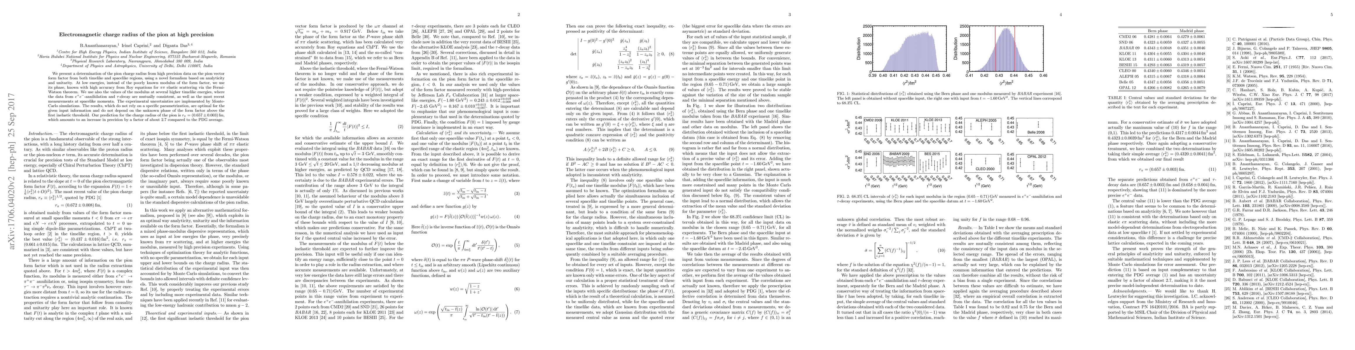 This paper presents a high-precision determination of the pion charge radius using a novel formalism based on analyticity and unitarity, achieving a significant improvement in precision over previous estimates. The result, $r_\pi=(0.657 \pm 0.003) \fm$, is derived from high-accuracy phase information and recent experimental data, with uncertainties managed through Monte-Carlo simulations.