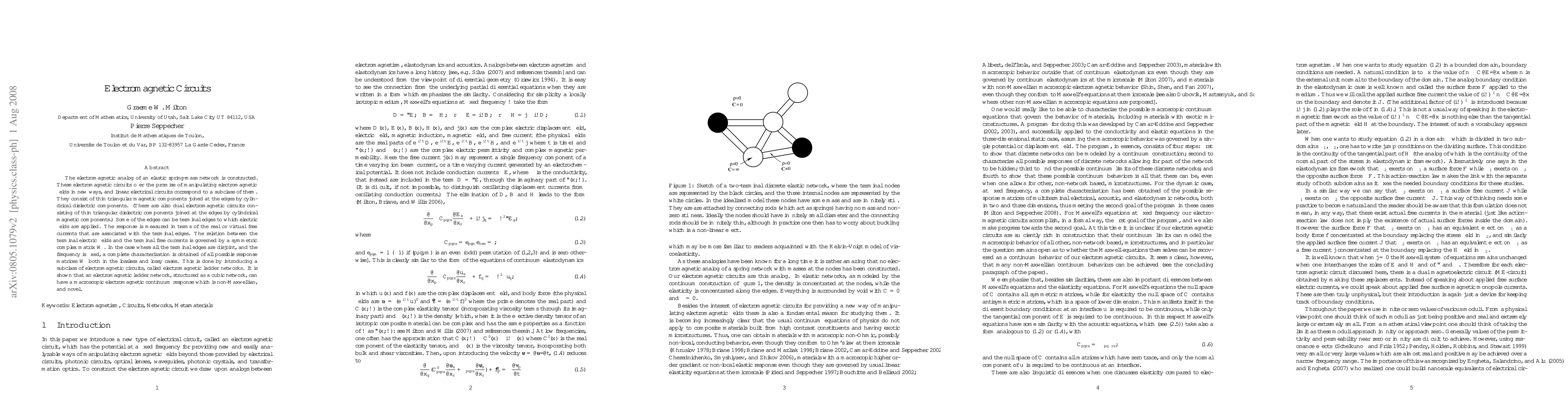 The electromagnetic analog of an elastic spring-mass network is constructed. These electromagnetic circuits offer the promise of manipulating electromagnetic fields in new ways, and linear electrical circuits correspond to a subclass of them. They consist of thin triangular magnetic components joined at the edges by cylindrical dielectric components. (There are also dual electromagnetic circuits consisting of thin triangular dielectric components joined at the edges by cylindrical magnetic components.) Some of the edges can be terminal edges to which electric fields are applied. The response is measured in terms of the real or virtual free currents that are associated with the terminal edges. The relation between the terminal electric fields and the terminal free currents is governed by a symmetric complex matrix $\BW$. In the case where all the terminal edges are disjoint, and the frequency is fixed, a complete characterization is obtained of all possible response matrices $\BW$ both in the lossless and lossy cases. This is done by introducing a subclass of electromagnetic circuits, called electromagnetic ladder networks. It is shown that an electromagnetic ladder network, structured as a cubic network, can have a macroscopic electromagnetic continuum response which is non-Maxwellian, and novel.