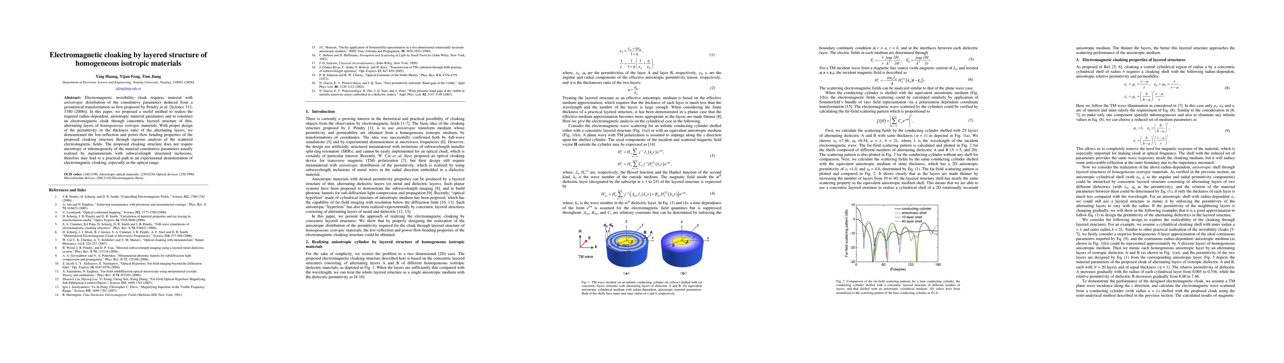 This paper proposes a method for electromagnetic cloaking using a concentric layered structure of thin, alternating layers of homogeneous isotropic materials, achieving low-reflection and power-flow bending properties without requiring anisotropic or inhomogeneous material properties typically found in metamaterials. The design aims to provide a practical approach to experimental demonstration of electromagnetic cloaking in the optical range.