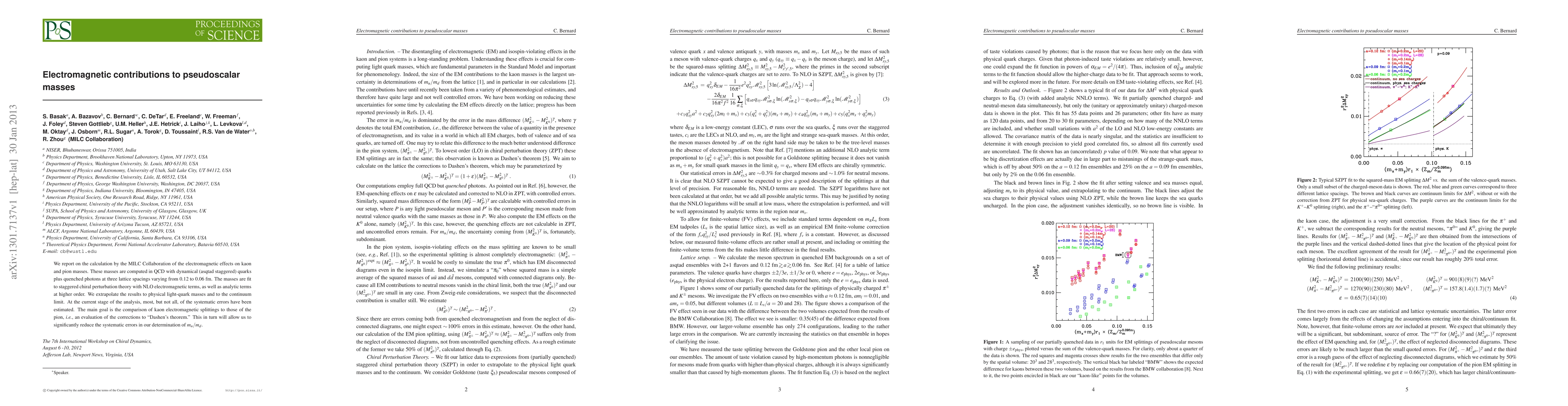 The MILC Collaboration calculates electromagnetic effects on kaon and pion masses using QCD with dynamical quarks and quenched photons, fitting results to staggered chiral perturbation theory. The goal is to compare kaon and pion electromagnetic splittings to refine the determination of the ratio m_u/m_d, reducing systematic errors.