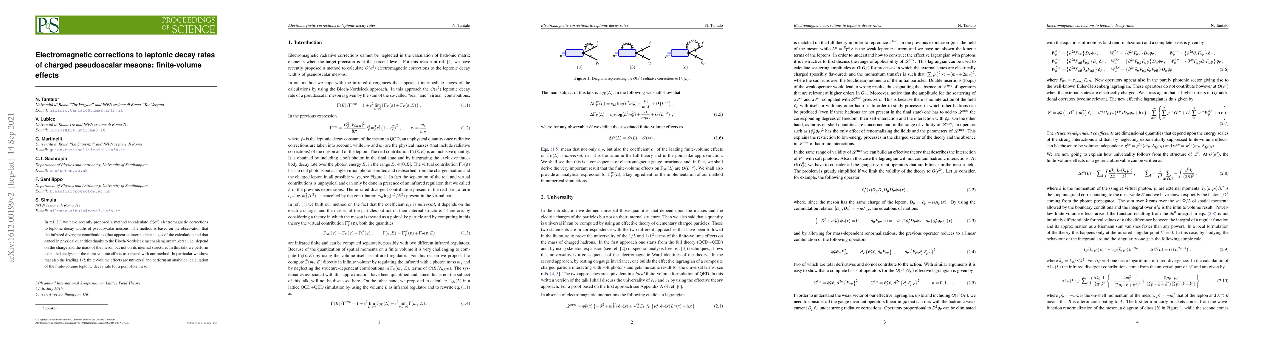 In Carrasco et al. we have recently proposed a method to calculate $O(e^2)$ electromagnetic corrections to leptonic decay widths of pseudoscalar mesons. The method is based on the observation that the infrared divergent contributions (that appear at intermediate stages of the calculation and that cancel in physical quantities thanks to the Bloch-Nordsieck mechanism) are universal, i.e. depend on the charge and the mass of the meson but not on its internal structure. In this talk we perform a detailed analysis of the finite-volume effects associated with our method. In particular we show that also the leading $1/L$ finite-volume effects are universal and perform an analytical calculation of the finite-volume leptonic decay rate for a point-like meson.