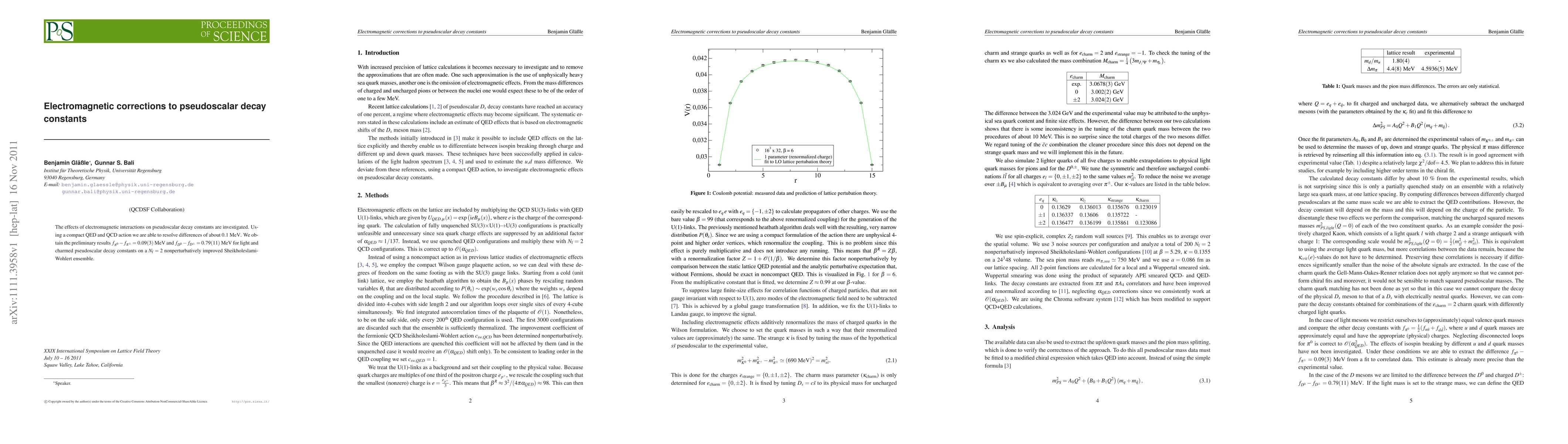 This paper investigates electromagnetic corrections to pseudoscalar decay constants, achieving precision of about 0.1 MeV. Preliminary results show differences of 0.09(3) MeV for light pseudoscalars and 0.79(11) MeV for charmed pseudoscalars.