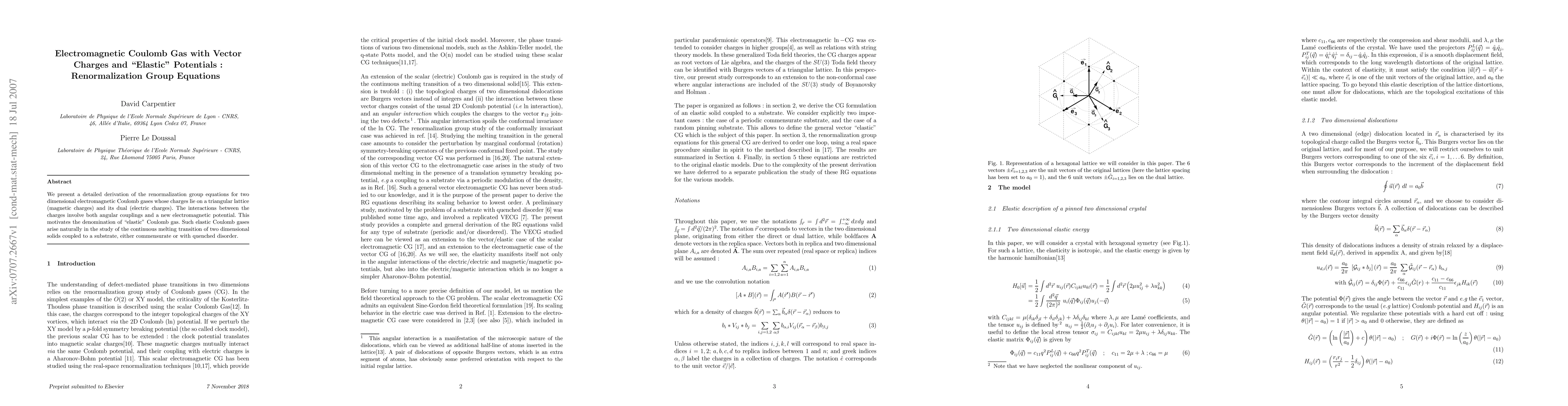 This paper derives renormalization group equations for two-dimensional electromagnetic Coulomb gases on triangular lattices, incorporating both angular couplings and a novel electromagnetic potential termed "elastic." These models are relevant for studying continuous melting transitions in solid materials coupled to substrates.