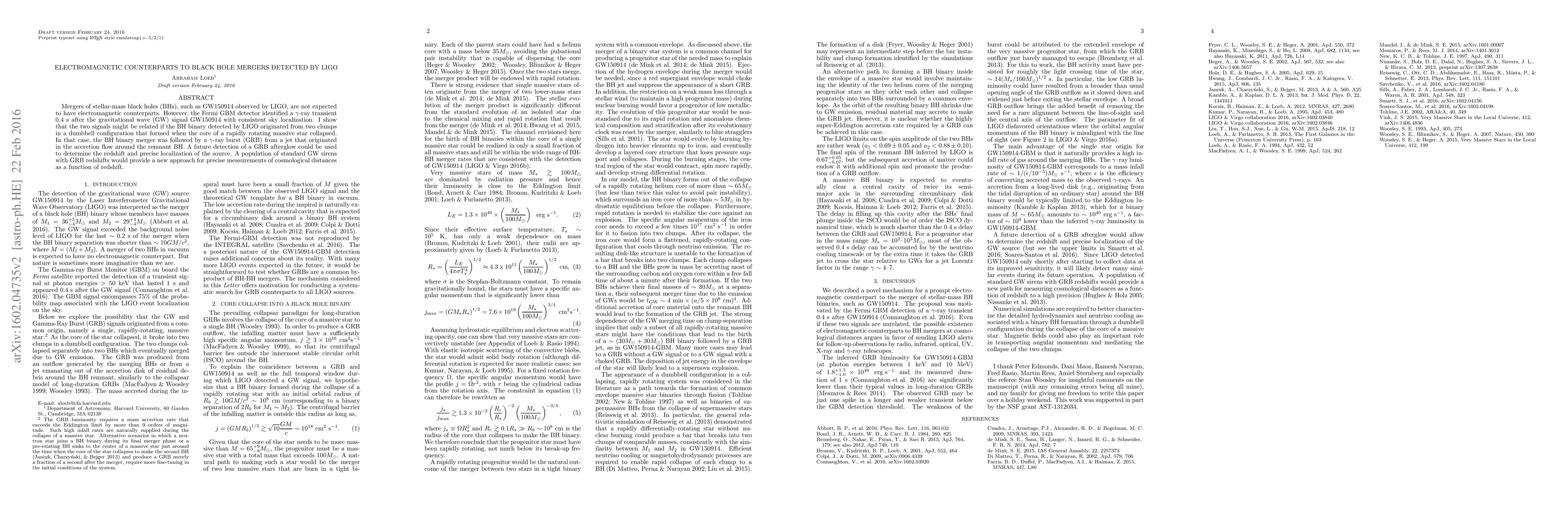 This paper explores the possibility of electromagnetic counterparts to black hole mergers detected by LIGO, suggesting a gamma-ray transient detected by Fermi GBM may be linked to the merger of a black hole binary in a dumbbell configuration. Such a detection could lead to precise measurements of cosmological distances.