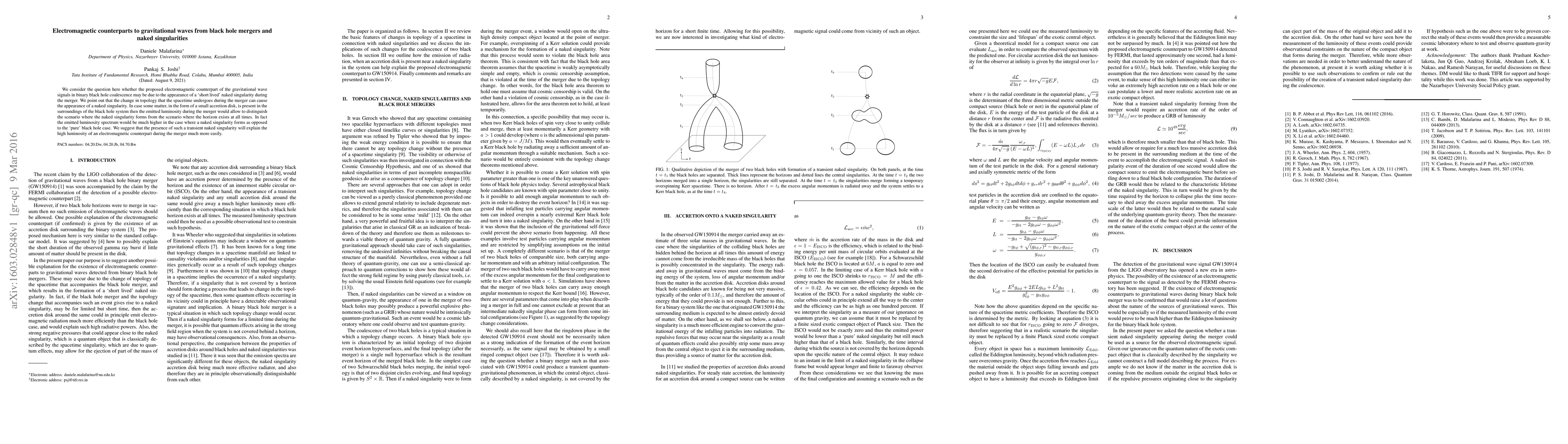 We consider the question here whether the proposed electromagnetic counterpart of the gravitational wave signals in binary black hole coalescence may be due to the appearance of a `short lived' naked singularity during the merger. We point out that the change in topology that the spacetime undergoes during the merger can cause the appearance of a naked singularity. In case some matter, in the form of a small accretion disk, is present in the surroundings of the black hole system then the emitted luminosity during the merger would allow to distinguish the scenario where the naked singularity forms from the scenario where the horizon exists at all times. In fact the emitted luminosity spectrum would be much higher in the case where a naked singularity forms as opposed to the `pure' black hole case. We suggest that the presence of such a transient naked singularity will explain the high luminosity of an electromagnetic counterpart during the merger much more easily.
