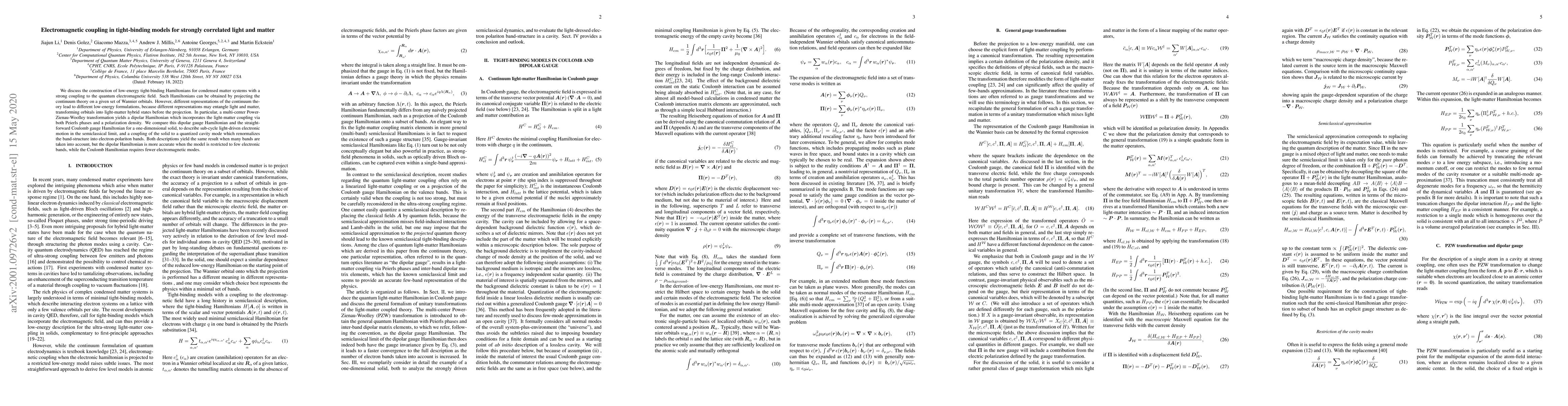 This paper constructs low-energy tight-binding Hamiltonians for strongly correlated light-matter systems, comparing the dipolar Hamiltonian from a multi-center Power-Zienau-Woolley transformation with the Coulomb gauge Hamiltonian. The dipolar model is more accurate for few bands but both yield the same results for many bands.