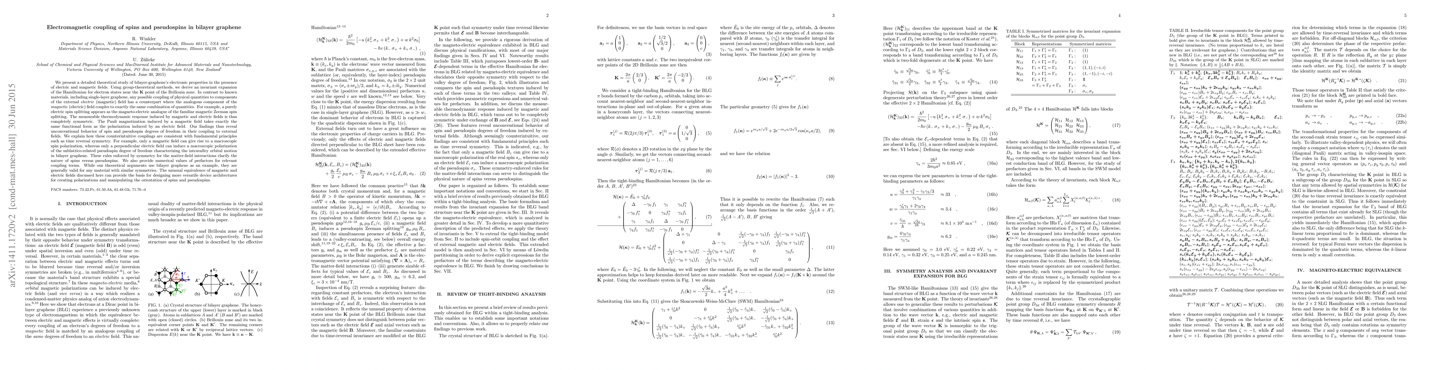 We present a detailed theoretical study of bilayer-graphene's electronic properties in the presence of electric and magnetic fields. Using group-theoretical methods, we derive an invariant expansion of the Hamiltonian for electron states near the K point of the Brillouin zone. In contrast to known materials, including single-layer graphene, any possible coupling of physical quantities to components of the external electric (magnetic) field has a counterpart where the analogous component of the magnetic (electric) field couples to exactly the same combination of quantities. For example, a purely electric spin splitting appears as the magneto-electric analogue of the familiar magnetic Zeeman spin splitting. The measurable thermodynamic response induced by magnetic and electric fields is thus completely symmetric. The Pauli magnetization induced by a magnetic field takes exactly the same functional form as the polarization induced by an electric field. Our findings thus reveal unconventional behavior of spin and pseudospin degrees of freedom in their coupling to external fields. We explain how these counterintuitive couplings are consistent with fundamental principles such as time reversal symmetry. For example, only a magnetic field can give rise to a macroscopic spin polarization, whereas only a perpendicular electric field can induce a macroscopic polarization of the sublattice-related pseudospin degree of freedom characterizing the intravalley orbital motion in bilayer graphene. These rules enforced by symmetry for the matter-field interactions clarify the nature of spins versus pseudospins. We also provide numerical values of prefactors for relevant coupling terms. While our theoretical arguments use bilayer graphene as an example, they are generally valid for any material with similar symmetries.