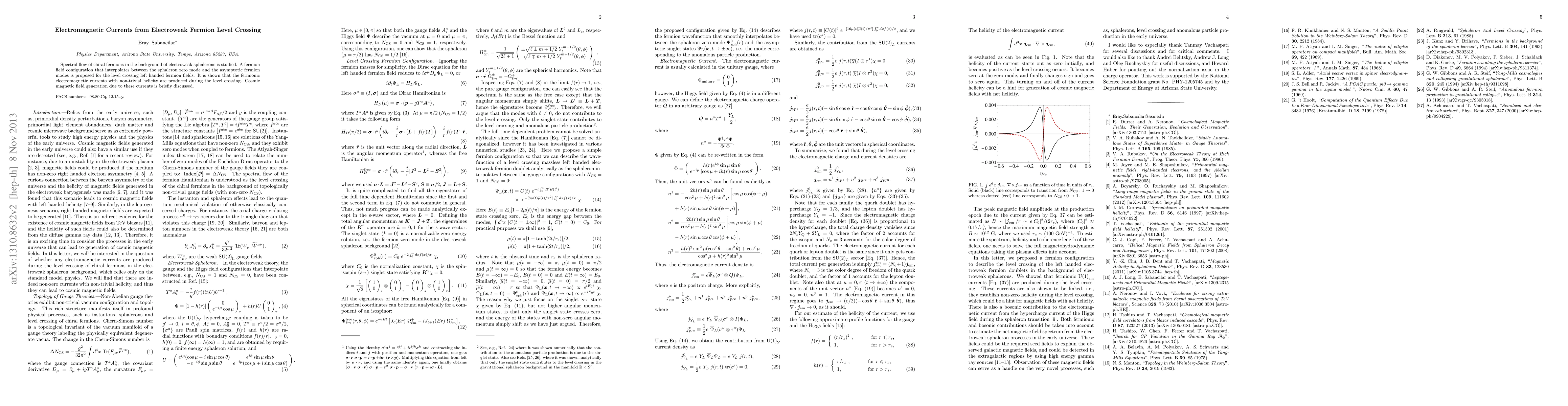 Spectral flow of chiral fermions in the background of electroweak sphalerons is studied. A fermion field configuration that interpolates between the sphaleron zero mode and the asymptotic fermion modes is proposed for the level crossing left handed fermion fields. It is shown that the fermionic electromagnetic currents with non-trivial helicity are produced during the level crossing. Cosmic magnetic field generation due to these currents is briefly discussed.