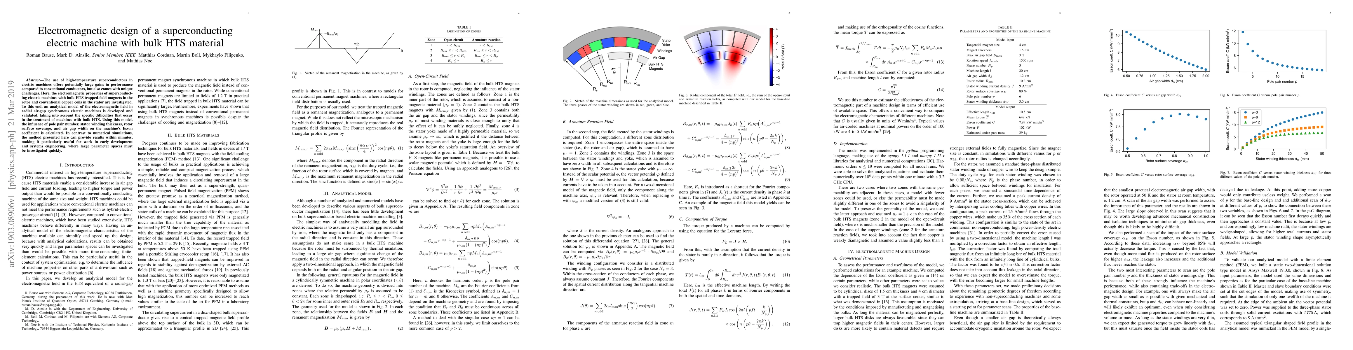 This paper develops an analytical model to investigate electromagnetic properties of superconducting electric machines with bulk HTS magnets and copper coils, focusing on factors like pole pair number and air gap width. The model offers rapid results, aiding early development and systems engineering.