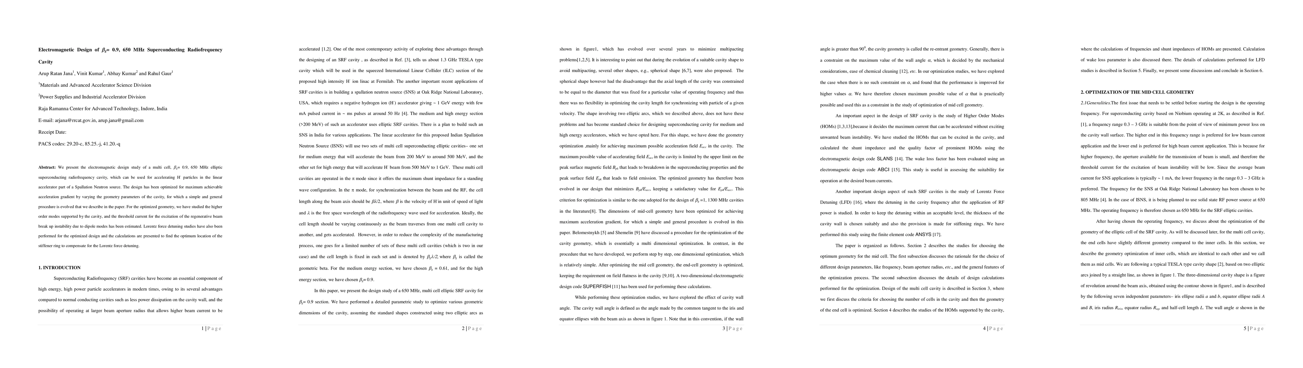 We present the electromagnetic design study of a multi cell, \beta_g= 0.9, 650 MHz elliptic superconducting radiofrequency cavity, which can be used for accelerating H- particles in the linear accelerator part of a Spallation Neutron source. The design has been optimized for maximum achievable acceleration gradient by varying the geometry parameters of the cavity, for which a simple and general procedure is evolved that we describe in the paper. For the optimized geometry, we have studied the higher order modes supported by the cavity, and the threshold current for the excitation of the regenerative beam break up instability due to dipole modes has been estimated. Lorentz force detuning studies have also been performed for the optimized design and the calculations are presented to find the optimum location of the stiffener ring to compensate for the Lorentz force detuning.
