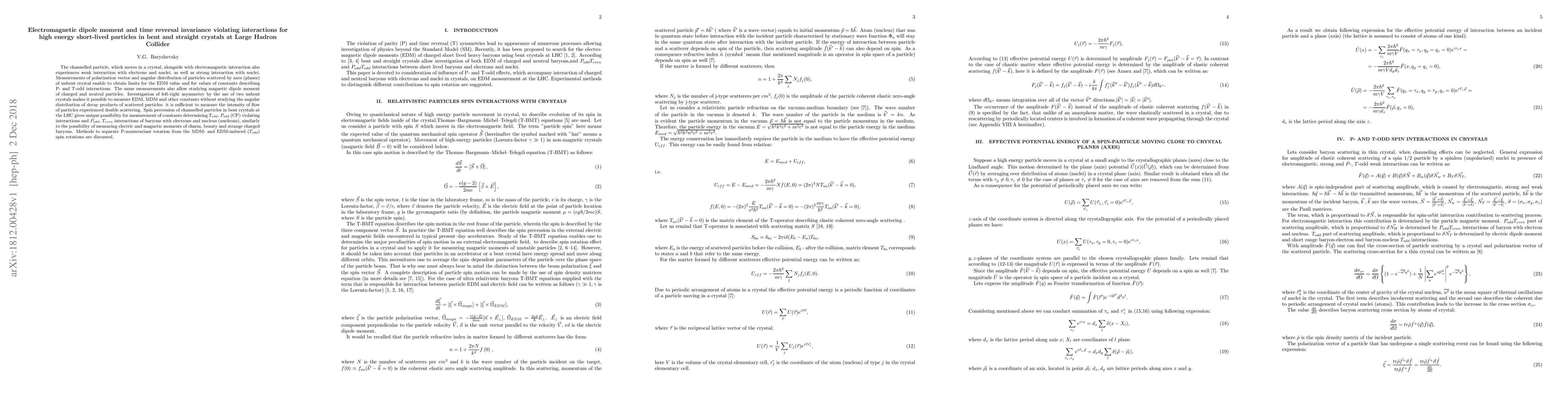 This paper explores the electromagnetic dipole moment (EDM) and time reversal invariance violating (T-odd) interactions for high energy particles in crystals at the LHC, using measurements of polarization and angular distributions to determine EDM values and constants for P- and T-odd interactions. It also discusses methods to separate P-noninvariant rotations from MDM- and EDM-induced spin rotations in bent crystals.