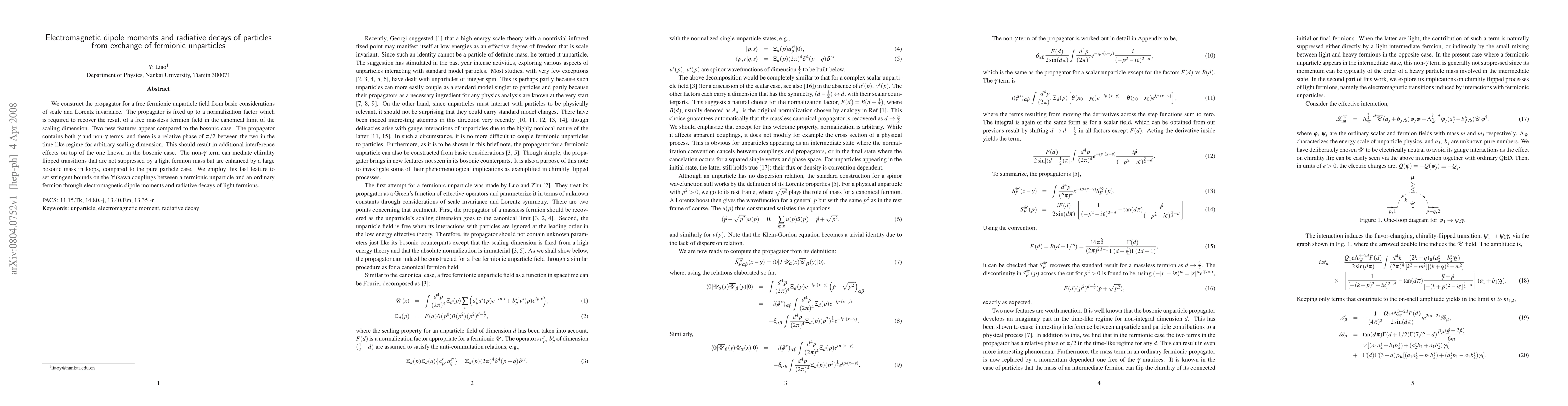 We construct the propagator for a free fermionic unparticle field from basic considerations of scale and Lorentz invariance. The propagator is fixed up to a normalization factor which is required to recover the result of a free massless fermion field in the canonical limit of the scaling dimension. Two new features appear compared to the bosonic case. The propagator contains both \gamma and non-\gamma terms, and there is a relative phase of \pi/2 between the two in the time-like regime for arbitrary scaling dimension. This should result in additional interference effects on top of the one known in the bosonic case. The non-\gamma term can mediate chirality flipped transitions that are not suppressed by a light fermion mass but are enhanced by a large bosonic mass in loops, compared to the pure particle case. We employ this last feature to set stringent bounds on the Yukawa couplings between a fermionic unparticle and an ordinary fermion through electromagnetic dipole moments and radiative decays of light fermions.