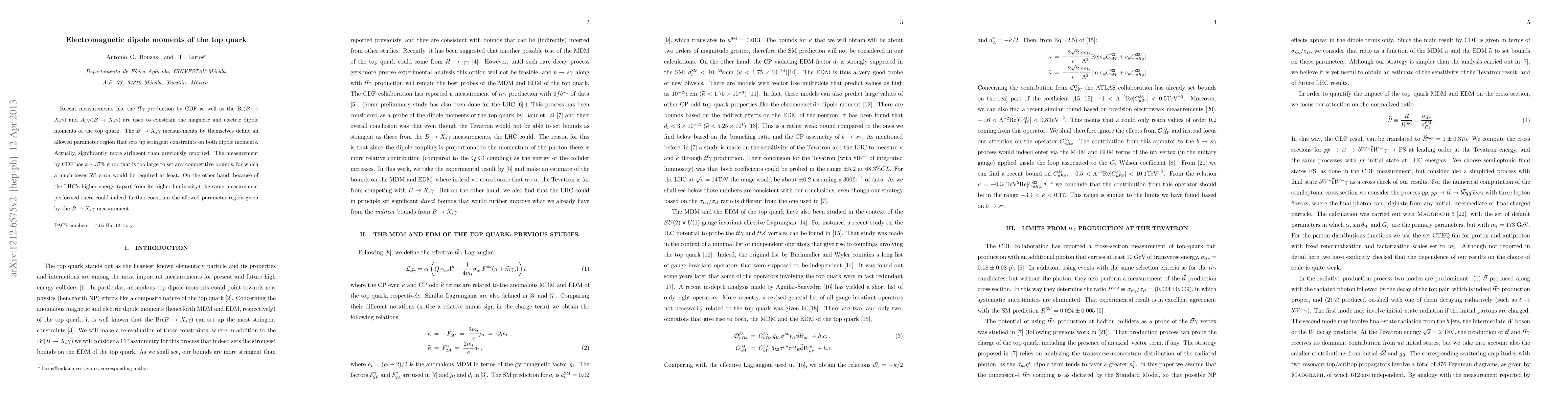 Recent measurements like the t tbar gamma production by CDF as well as the Br(B ->Xs gamma) and ACP (B->Xs gamma) are used to constrain the magnetic and electric dipole moments of the top quark. The B->Xs gamma measurements by themselves define an allowed parameter region that sets up stringent constraints on both dipole moments. Actually, significantly more stringent than previously reported. The measurement by CDF has a 37% error that is too large to set any competitive bounds, for which a much lower 5% error would be required at least. On the other hand, because of the LHC's higher energy (apart from its higher luminosity) the same measurement performed there could indeed further constrain the allowed parameter region given by the B->Xs gamma measurement.