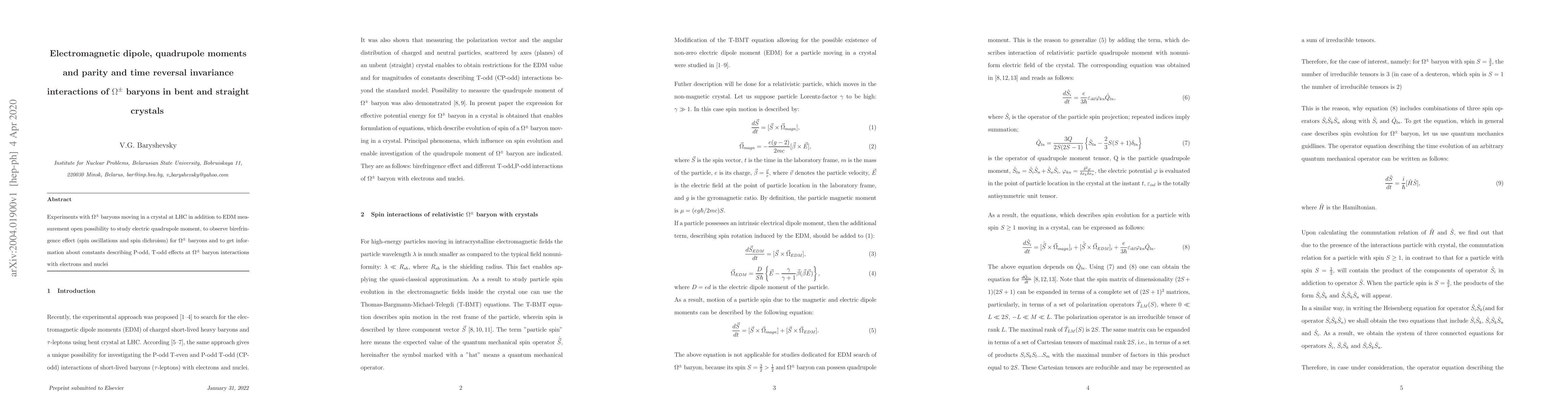 Summary: This research explores the electromagnetic properties of $\Omega^{\pm}$ baryons in crystals, focusing on electric quadrupole moments and P-odd, T-odd interactions. Experiments at the LHC aim to measure these properties and observe birefringence effects, providing insights into fundamental symmetries.