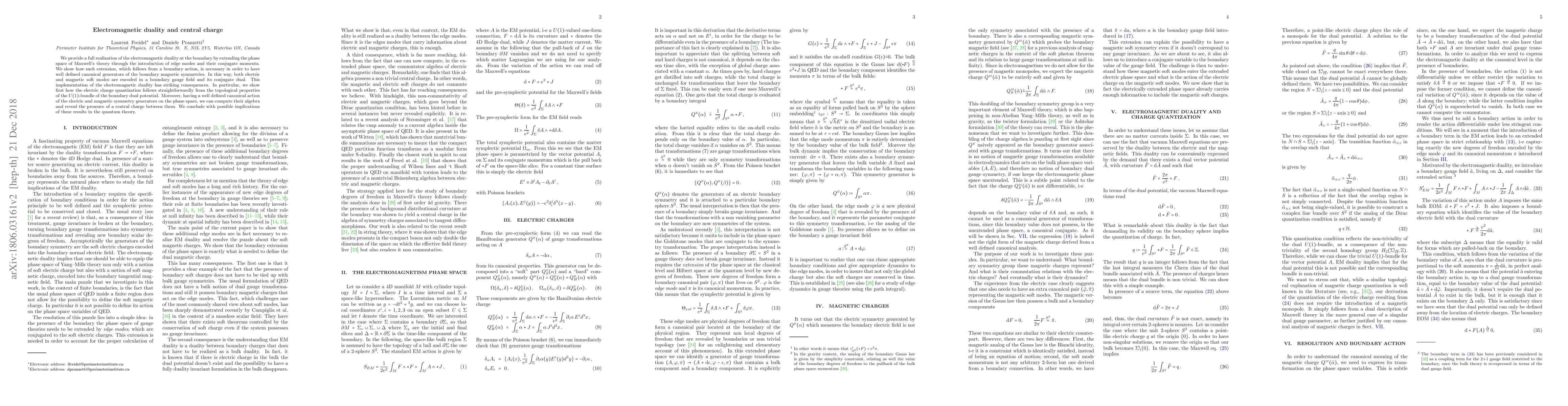 We provide a full realization of the electromagnetic duality at the boundary by extending the phase space of Maxwell's theory through the introduction of edge modes and their conjugate momenta. We show how such extension, which follows from a boundary action, is necessary in order to have well defined canonical generators of the boundary magnetic symmetries. In this way, both electric and magnetic soft modes are encoded in a boundary gauge field and its conjugate dual. This implementation of the electromagnetic duality has striking consequences. In particular, we show first how the electric charge quantization follows straightforwardly from the topological properties of the $U(1)$-bundle of the boundary dual potential. Moreover, having a well defined canonical action of the electric and magnetic symmetry generators on the phase space, we can compute their algebra and reveal the presence of a central charge between them. We conclude with possible implications of these results in the quantum theory.