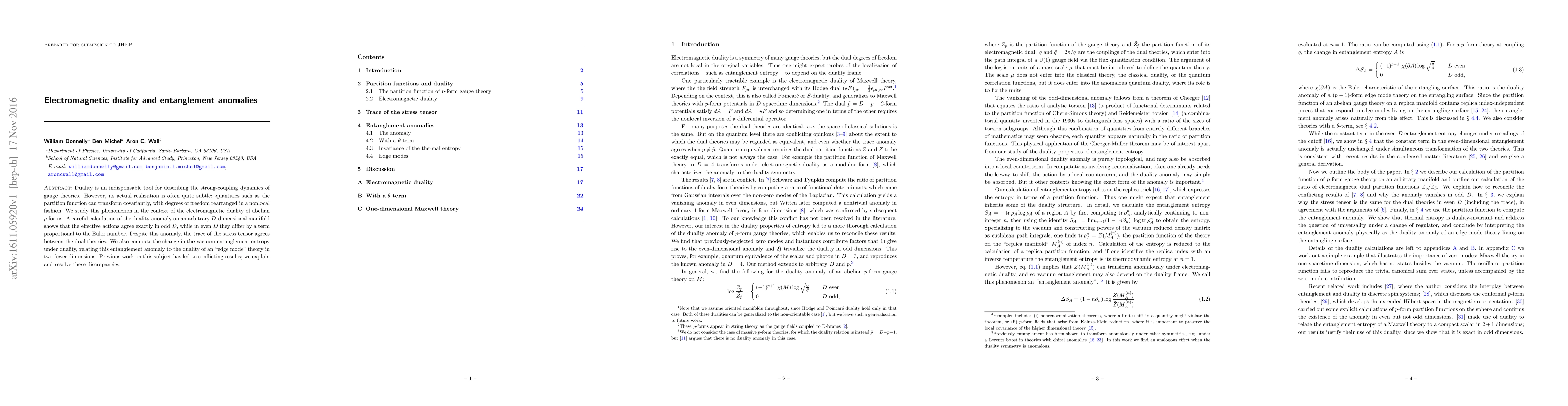 Duality is an indispensable tool for describing the strong-coupling dynamics of gauge theories. However, its actual realization is often quite subtle: quantities such as the partition function can transform covariantly, with degrees of freedom rearranged in a nonlocal fashion. We study this phenomenon in the context of the electromagnetic duality of abelian $p$-forms. A careful calculation of the duality anomaly on an arbitrary $D$-dimensional manifold shows that the effective actions agree exactly in odd $D$, while in even $D$ they differ by a term proportional to the Euler number. Despite this anomaly, the trace of the stress tensor agrees between the dual theories. We also compute the change in the vacuum entanglement entropy under duality, relating this entanglement anomaly to the duality of an "edge mode" theory in two fewer dimensions. Previous work on this subject has led to conflicting results; we explain and resolve these discrepancies.