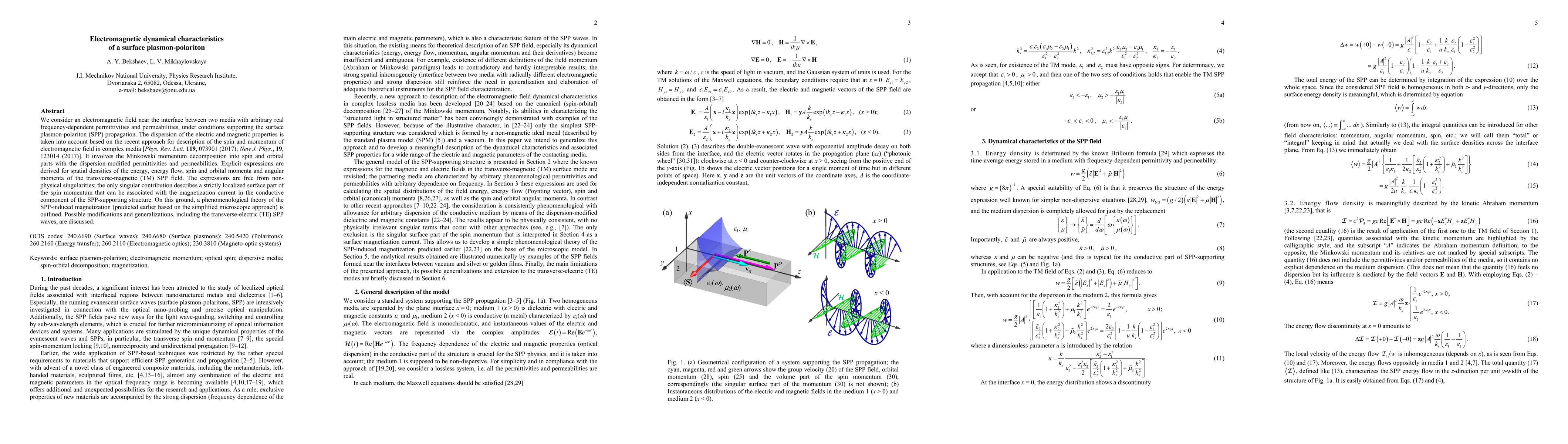 Researchers studied electromagnetic fields near an interface between two media, focusing on surface plasmon-polaritons (SPPs), and derived expressions for energy density, momentum, and angular momentum of the SPP field without non-physical singularities.