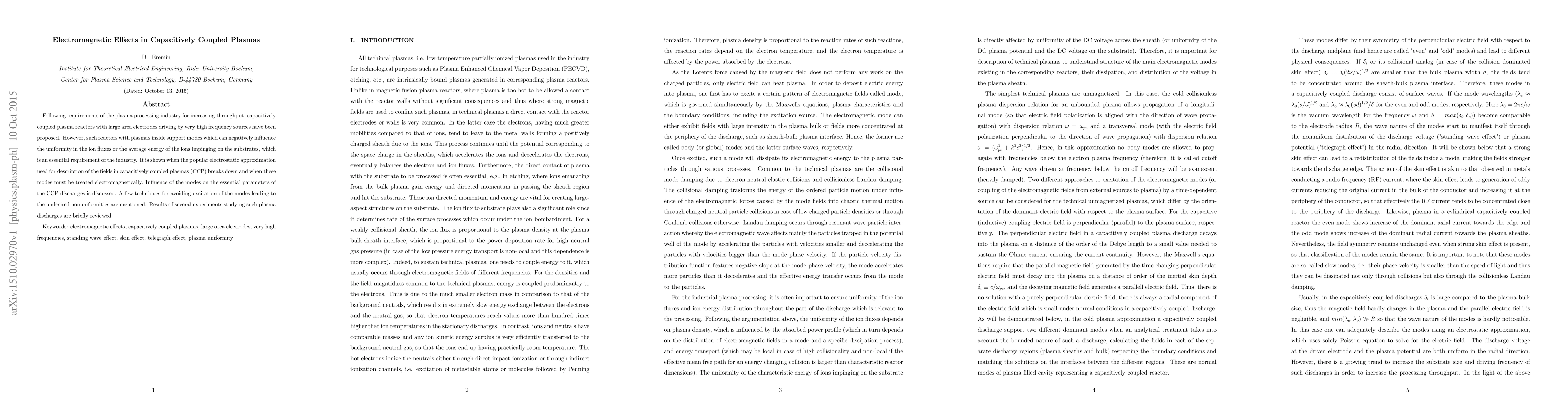 Following requirements of the plasma processing industry for increasing throughput, capacitively coupled plasma reactors with large area electrodes driving by very high frequency sources have been proposed. However, such reactors with plasmas inside support modes which can negatively influence the uniformity in the ion fluxes or the average energy of the ions impinging on the substrates, which is an essential requirement of the industry. It is shown when the popular electrostatic approximation used for description of the fields in capacitively coupled plasmas (CCP) breaks down and when these modes must be treated electromagnetically. Influence of the modes on the essential parameters of the CCP discharges is discussed. A few techniques for avoiding excitation of the modes leading to the undesired nonuniformities are mentioned. Results of several experiments studying such plasma discharges are briefly reviewed.