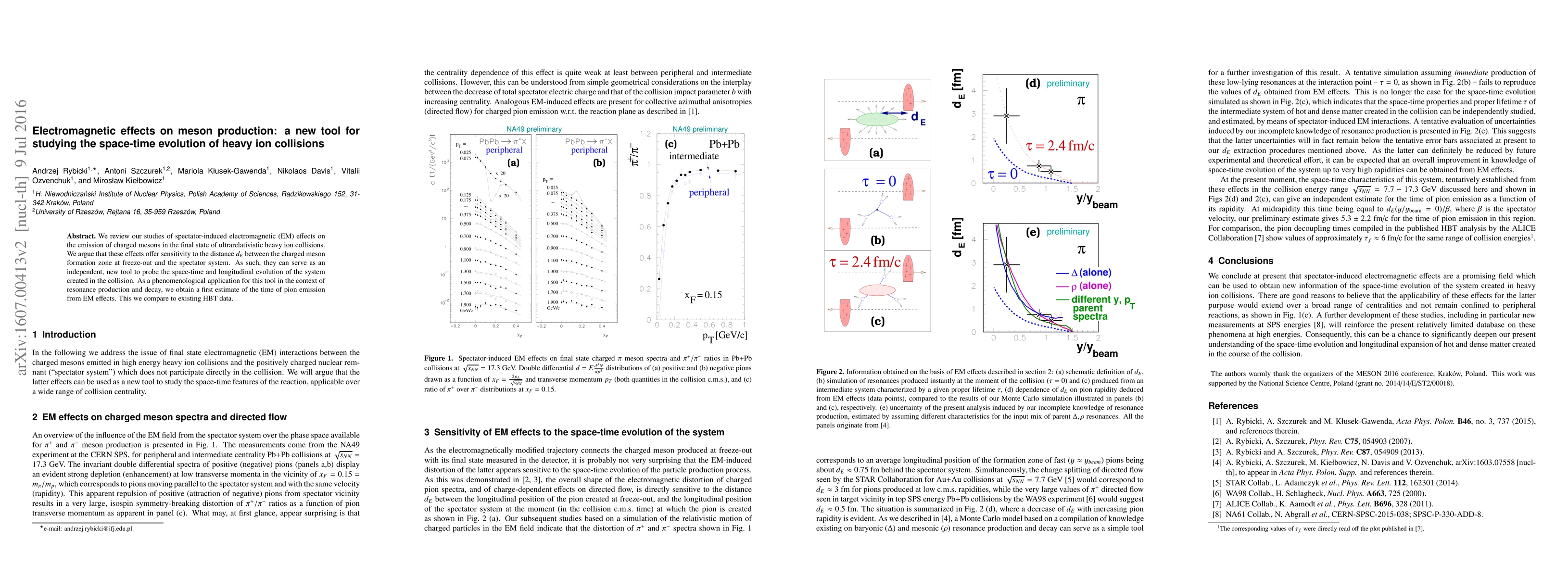 This paper reviews electromagnetic effects on charged meson emission in heavy ion collisions, proposing they reveal the distance between the meson formation zone and the spectator system, thus offering a new tool to study the space-time evolution of the collision. The authors estimate the time of pion emission from these effects and compare it to existing data.