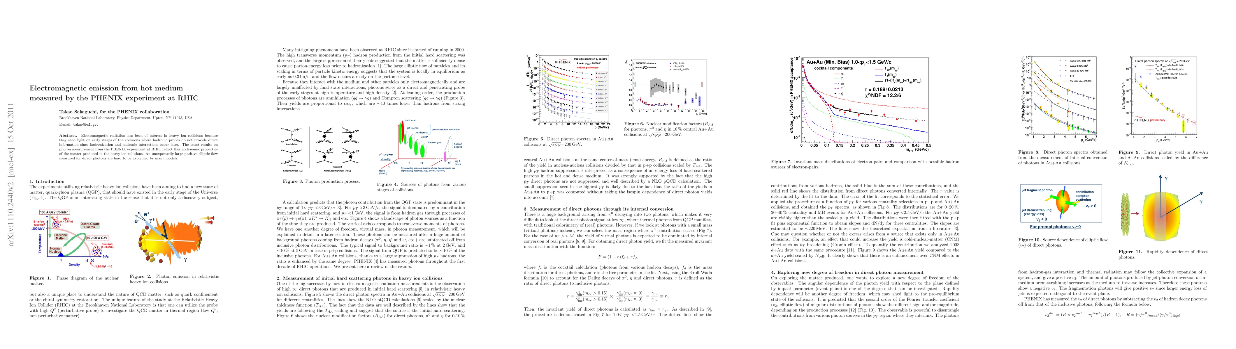 Electromagnetic radiation has been of interest in heavy ion collisions because they shed light on early stages of the collisions where hadronic probes do not provide direct information since hadronization and hadronic interactions occur later. The latest results on photon measurement from the PHENIX experiment at RHIC reflect thermodynamic properties of the matter produced in the heavy ion collisions. An unexpectedly large positive elliptic flow measured for direct photons can not be explained by any of the current models.