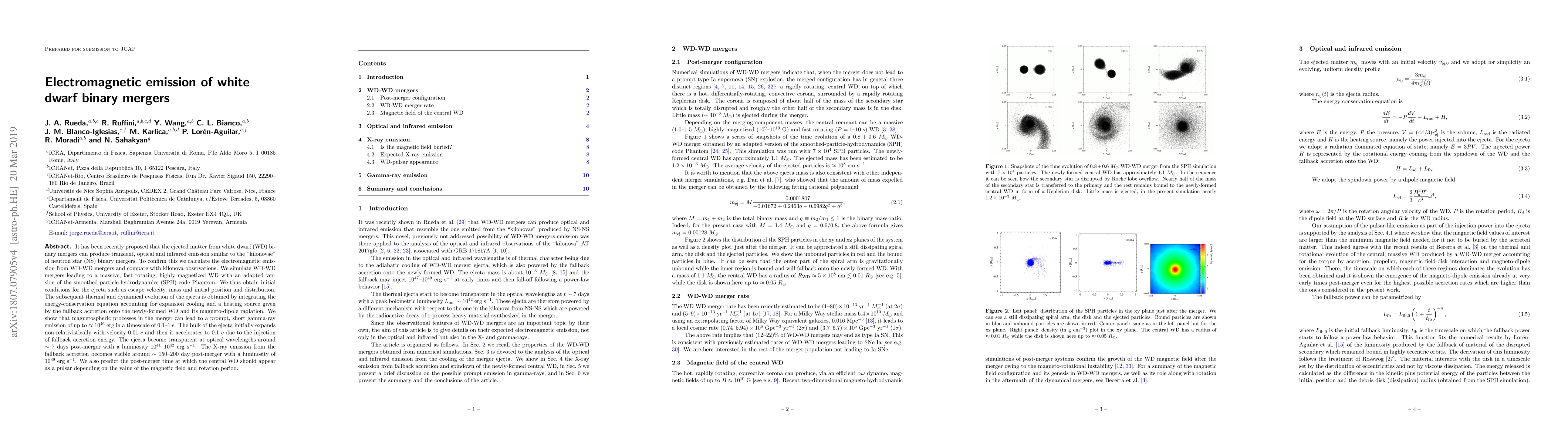 White dwarf binary mergers can produce electromagnetic emission similar to kilonovae, with predicted gamma-ray bursts, optical and infrared emissions, and X-ray signals visible days to months after the merger.